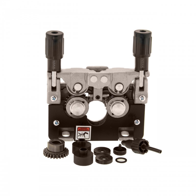 Podajnik wykonany jest z ciśnieniowo odlewanego aluminium co znaczenie wydłuża jego żywotność. Wyposażony jest w cztery rolki napędzane kołami zębatymi.