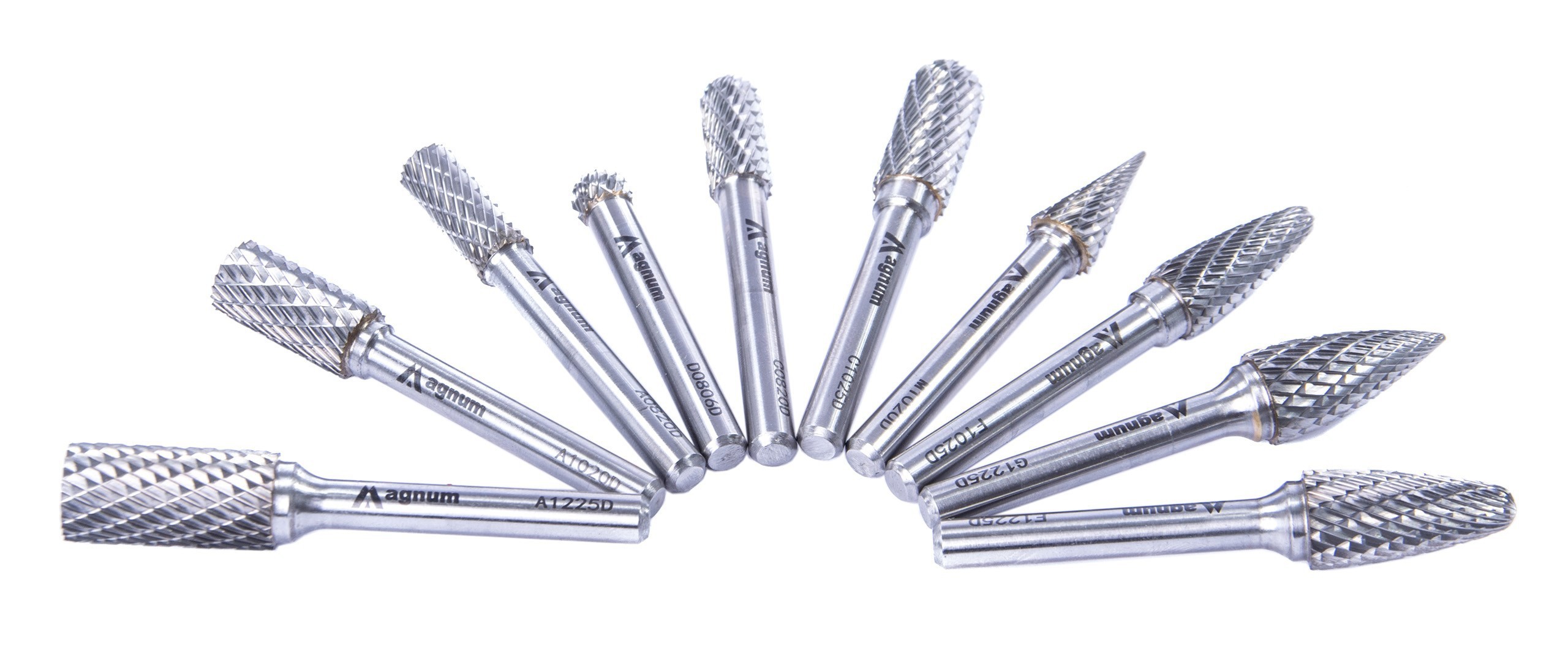 Zestaw pilników do metalu MAGNUM z węglika spiekanego VHM. Frezy ze stali szybkotnącej są zwykle używane do obróbki miękkiej stali, aluminium, brązu, mosiądzu itp. Wszystkie frezy posiadają średnicę chwytu 6 mm.
