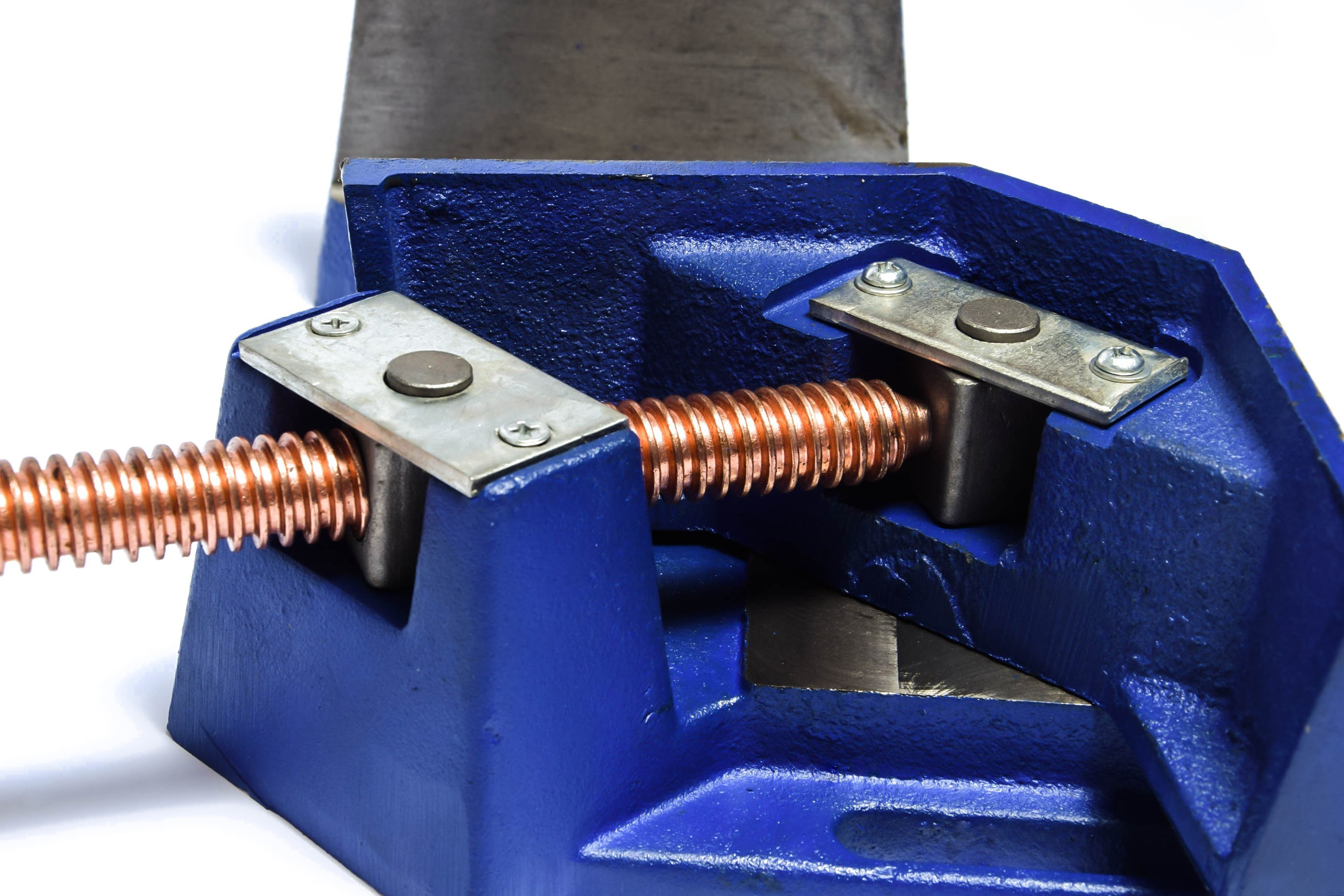 Ścisk prostokątny wahliwy marki MAGNUM pozwala na montaż elementów pod kątem prostym. Dzięki wahliwemu mocowaniu śruby i szczęki ruchomej możemy łączyć ze sobą elementy o różnych gabarytach. Posiada możliwość montażu do stołu (warsztatowego lub krzyżowego) za pomocą śrub M10.
