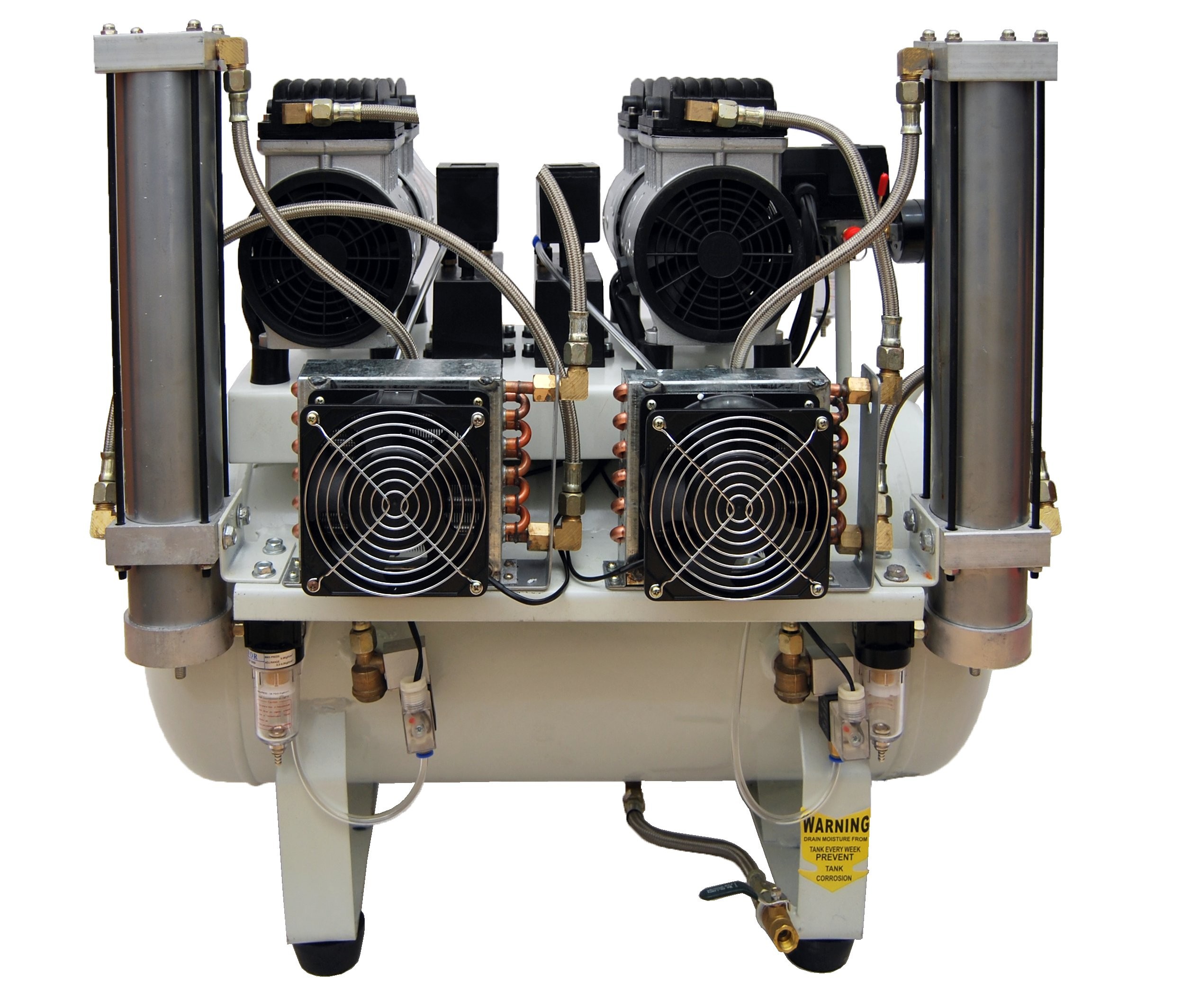 Profesjonalna bezolejowa tłokowa sprężarka z osuszaczem adsorbcyjnym. Przystosowana do pracy w laboratoriach, gabinetach medycznych, stomatologicznych i protetycznych. Niezastąpiona w miejscach w których wymagane jest źródło sprężonego, idealnie suchego i pozbawionego oleju powietrza. Dwie bezolejowe pompy zastosowane w kompresorze są niezwykle ciche i wydajne, a zastosowanie chłodnicy jeszcze bardziej poprawiła parametry całego urządzenia. Kompaktowa konstrukcja ze zintegrowanym osuszaczem czynią z niej idealne rozwiązanie dla gabinetów z małą ilością miejsca, a niski poziom hałasu (55 dB) pozwala na montaż bezpośrednio przy stanowisku pracy. Przyjazna w obsłudze, łatwa w serwisowaniu. Super wydajna i nowoczesna sprężarka, z emaliowanym od środka zbiornikiem, umożliwia podpięcie kilku unitów stomatologicznych, lub innych urządzeń wymagających niezwykle czystego i suchego powietrza. Najwyższej jakości materiały oraz sprawdzone komponenty czynią kompresor bardzo żywotnym i niezawodnym.