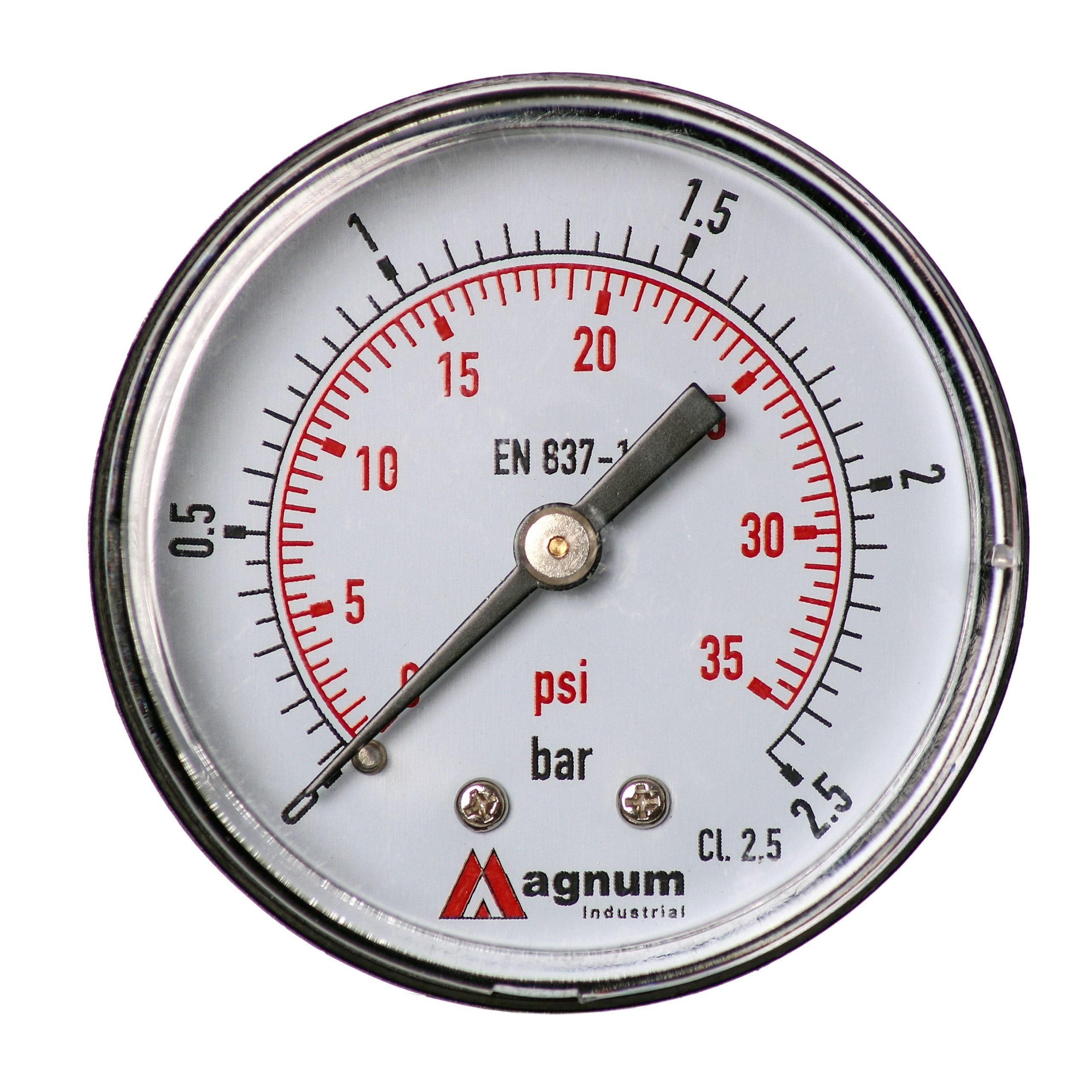 Wysokiej klasy manometr z rurką Bourdona marki MAGNUM wykonany zgodnie z normą EN 837-1 w klasie dokładności 2,5. Ciśnieniomierze ogólnego przeznaczenia do pomiaru ciśnienia gazów i cieczy chemicznie obojętnych na stopy miedzi i nie powodujących zatorów w układach ciśnienia.