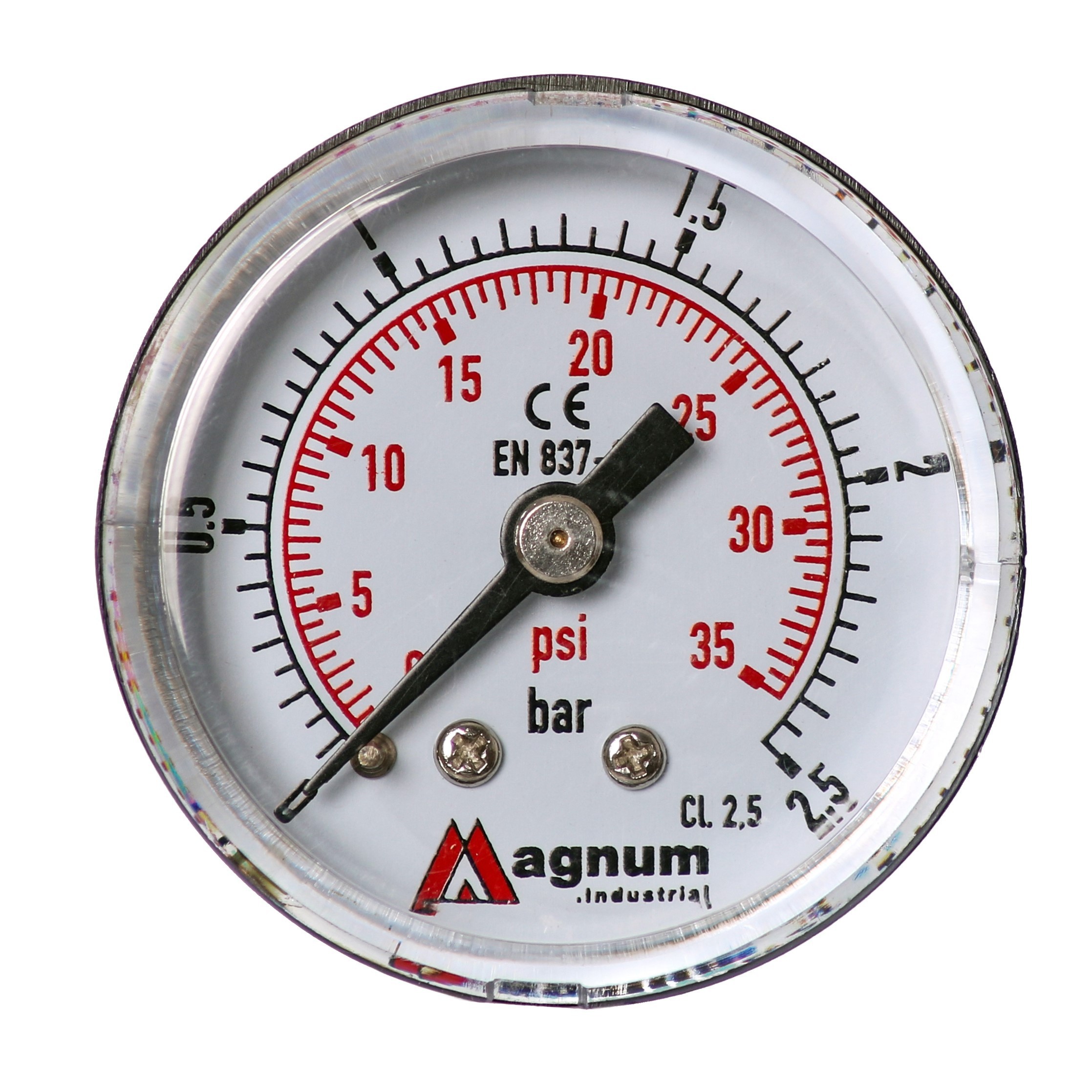 Wysokiej klasy manometr z rurką Bourdona marki MAGNUM wykonany zgodnie z normą EN 837-1 w klasie dokładności 2,5. Ciśnieniomierze ogólnego przeznaczenia do pomiaru ciśnienia gazów i cieczy chemicznie obojętnych na stopy miedzi i nie powodujących zatorów w układach ciśnienia.
