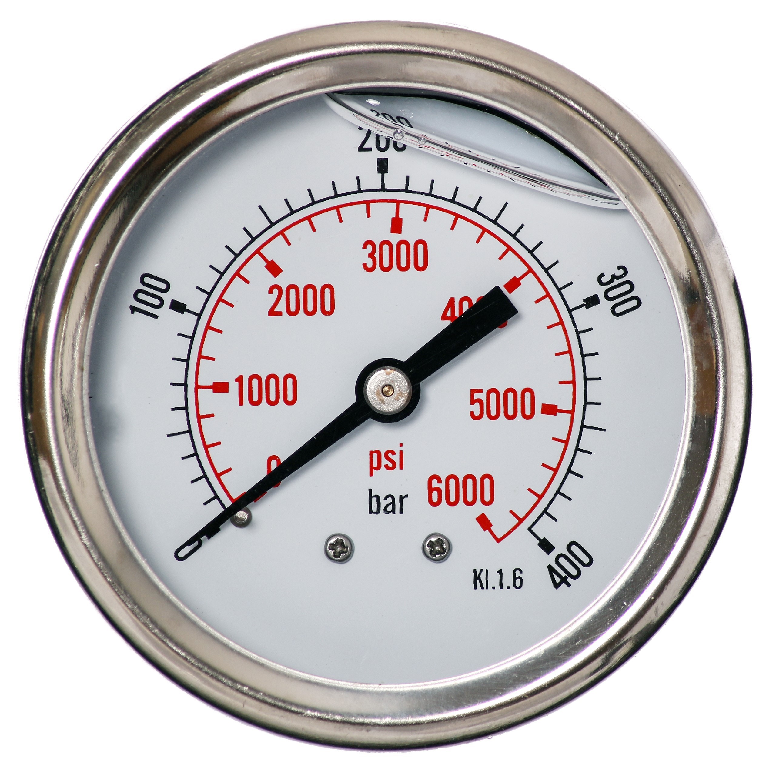 Manometr wypełniony gliceryną która niweluje drgania wskazówki podczas pracy urządzenia co pozwala na prawidłowy odczyt wartości ciśnienia.