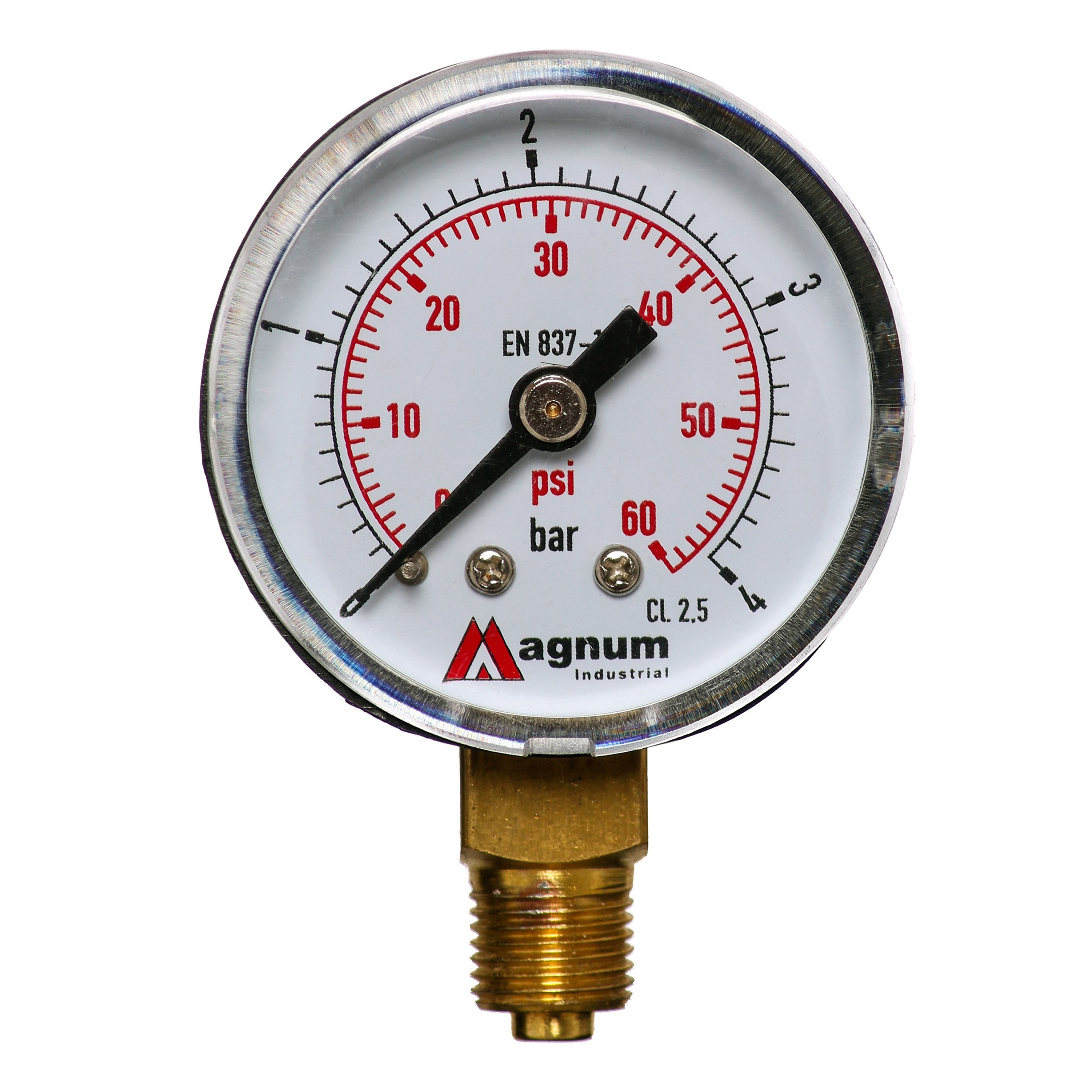 Wysokiej klasy manometr z rurką Bourdona marki MAGNUM wykonany zgodnie z normą EN 837-1 w klasie dokładności 2,5. Ciśnieniomierze ogólnego przeznaczenia do pomiaru ciśnienia gazów i cieczy chemicznie obojętnych na stopy miedzi i nie powodujących zatorów w układach ciśnienia.