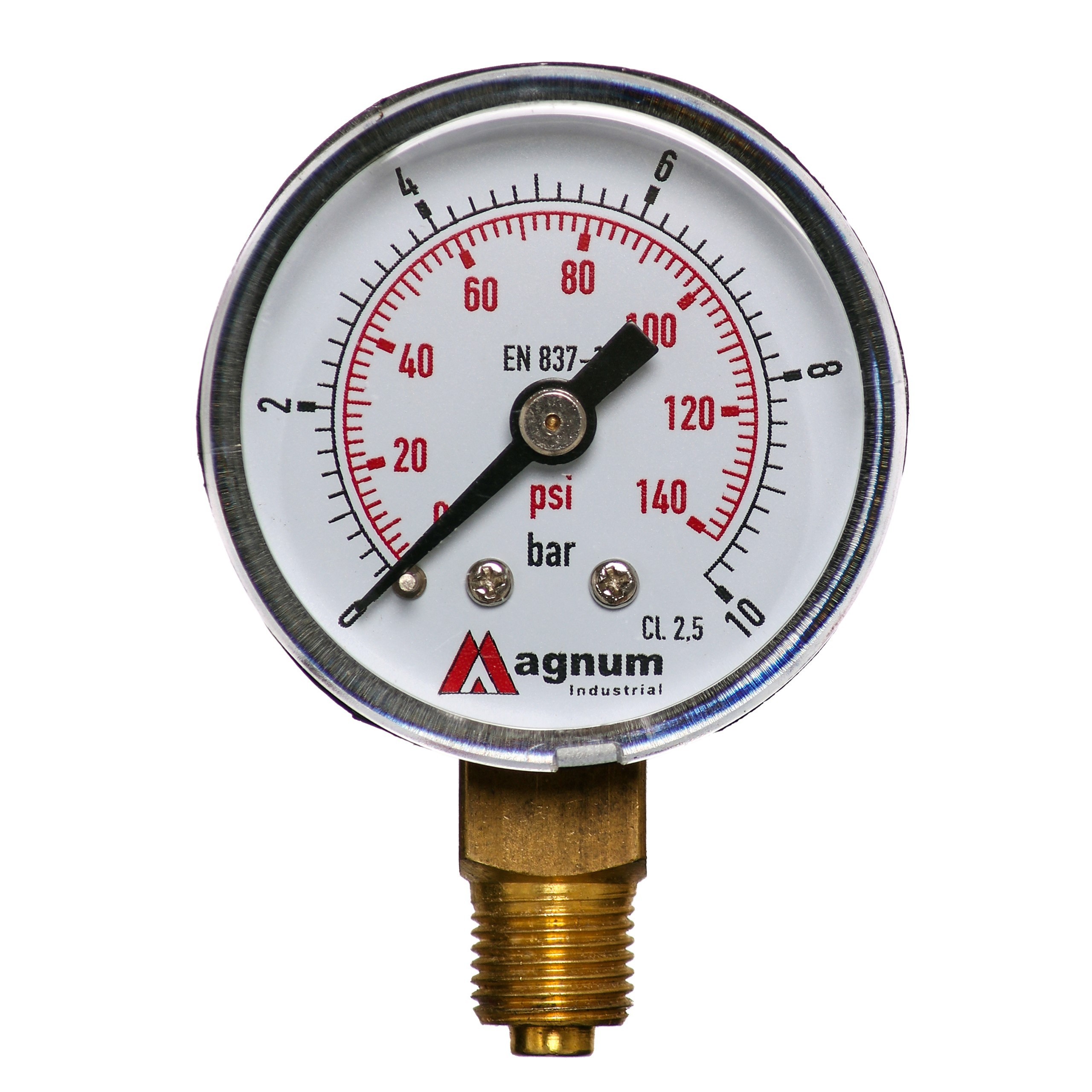 Wysokiej klasy manometr z rurką Bourdona marki MAGNUM wykonany zgodnie z normą EN 837-1 w klasie dokładności 2,5. Ciśnieniomierze ogólnego przeznaczenia do pomiaru ciśnienia gazów i cieczy chemicznie obojętnych na stopy miedzi i nie powodujących zatorów w układach ciśnienia.