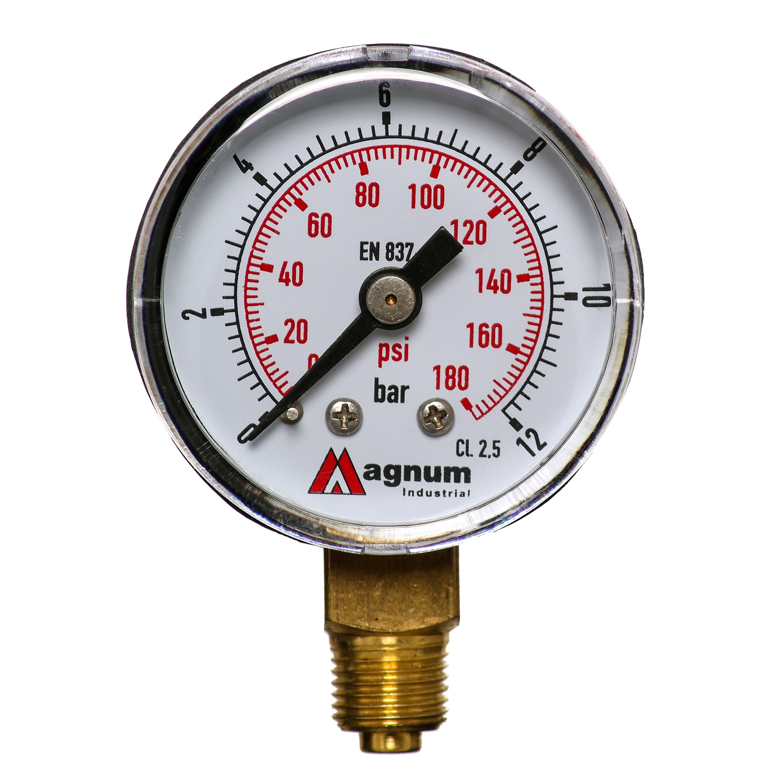 Wysokiej klasy manometr z rurką Bourdona marki MAGNUM wykonany zgodnie z normą EN 837-1 w klasie dokładności 2,5. Ciśnieniomierze ogólnego przeznaczenia do pomiaru ciśnienia gazów i cieczy chemicznie obojętnych na stopy miedzi i nie powodujących zatorów w układach ciśnienia.