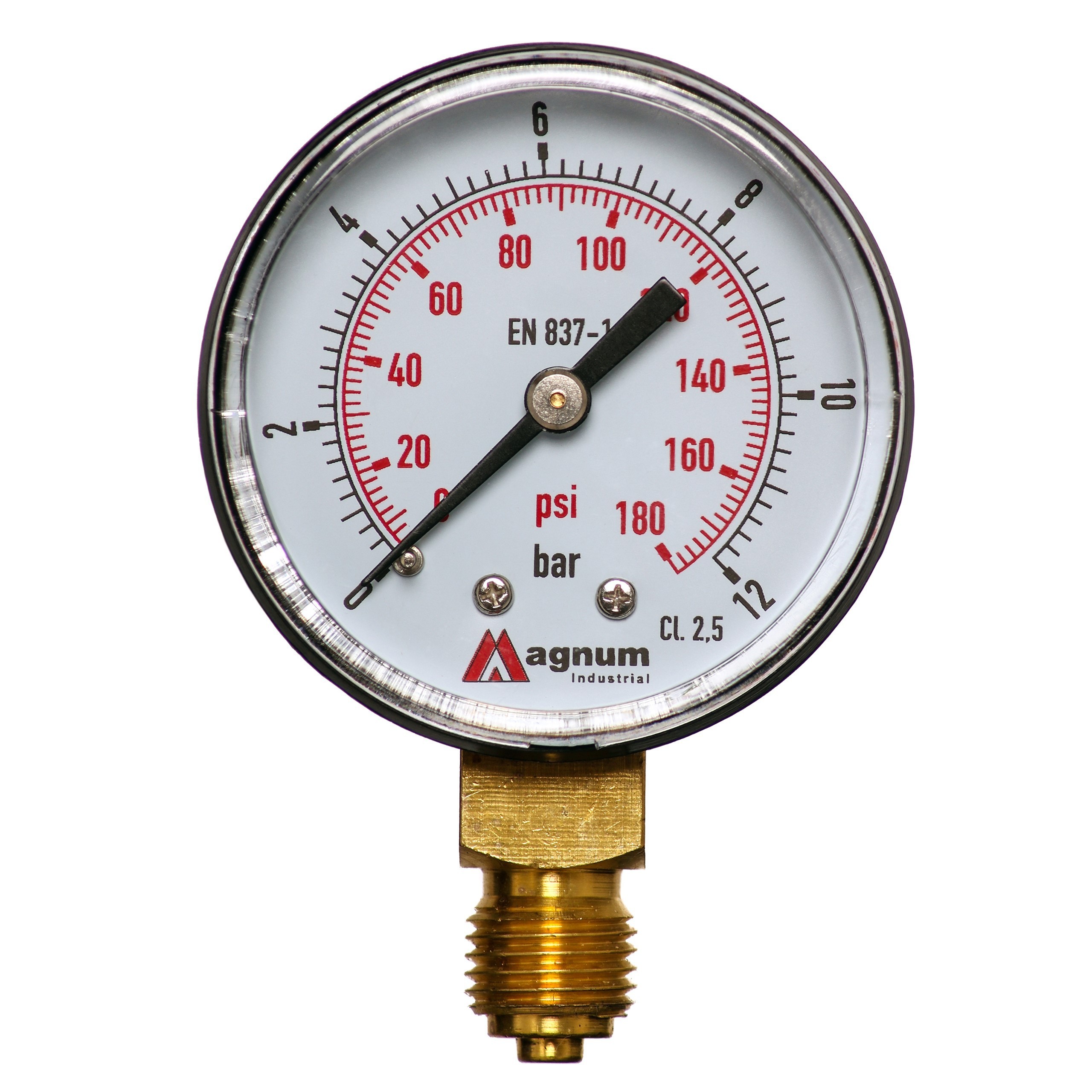 Wysokiej klasy manometr z rurką Bourdona marki MAGNUM wykonany zgodnie z normą EN 837-1 w klasie dokładności 2,5. Ciśnieniomierze ogólnego przeznaczenia do pomiaru ciśnienia gazów i cieczy chemicznie obojętnych na stopy miedzi i nie powodujących zatorów w układach ciśnienia.