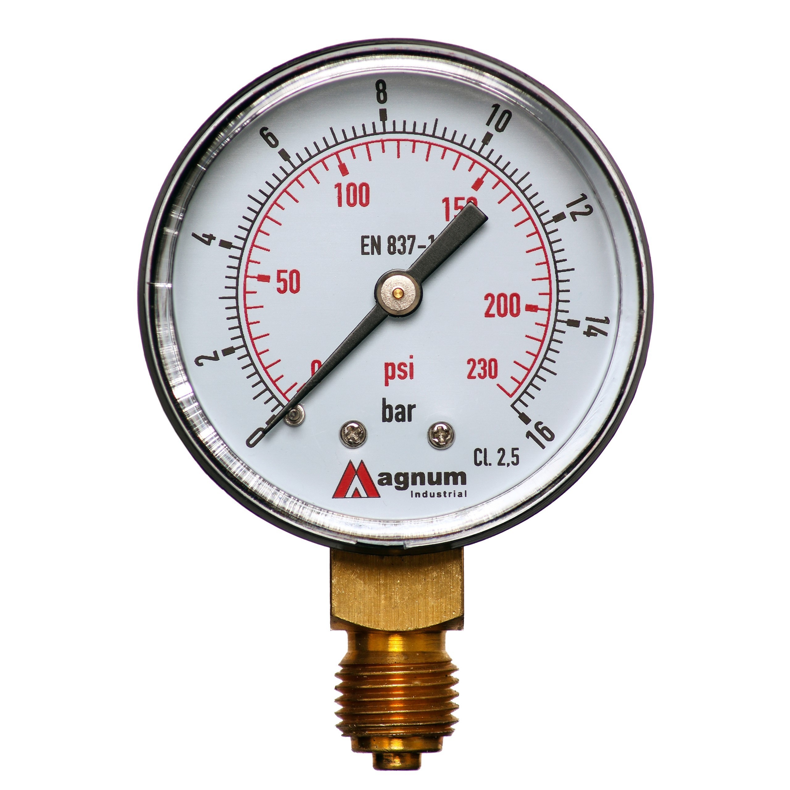 Wysokiej klasy manometr z rurką Bourdona marki MAGNUM wykonany zgodnie z normą EN 837-1 w klasie dokładności 2,5. Ciśnieniomierze ogólnego przeznaczenia do pomiaru ciśnienia gazów i cieczy chemicznie obojętnych na stopy miedzi i nie powodujących zatorów w układach ciśnienia.