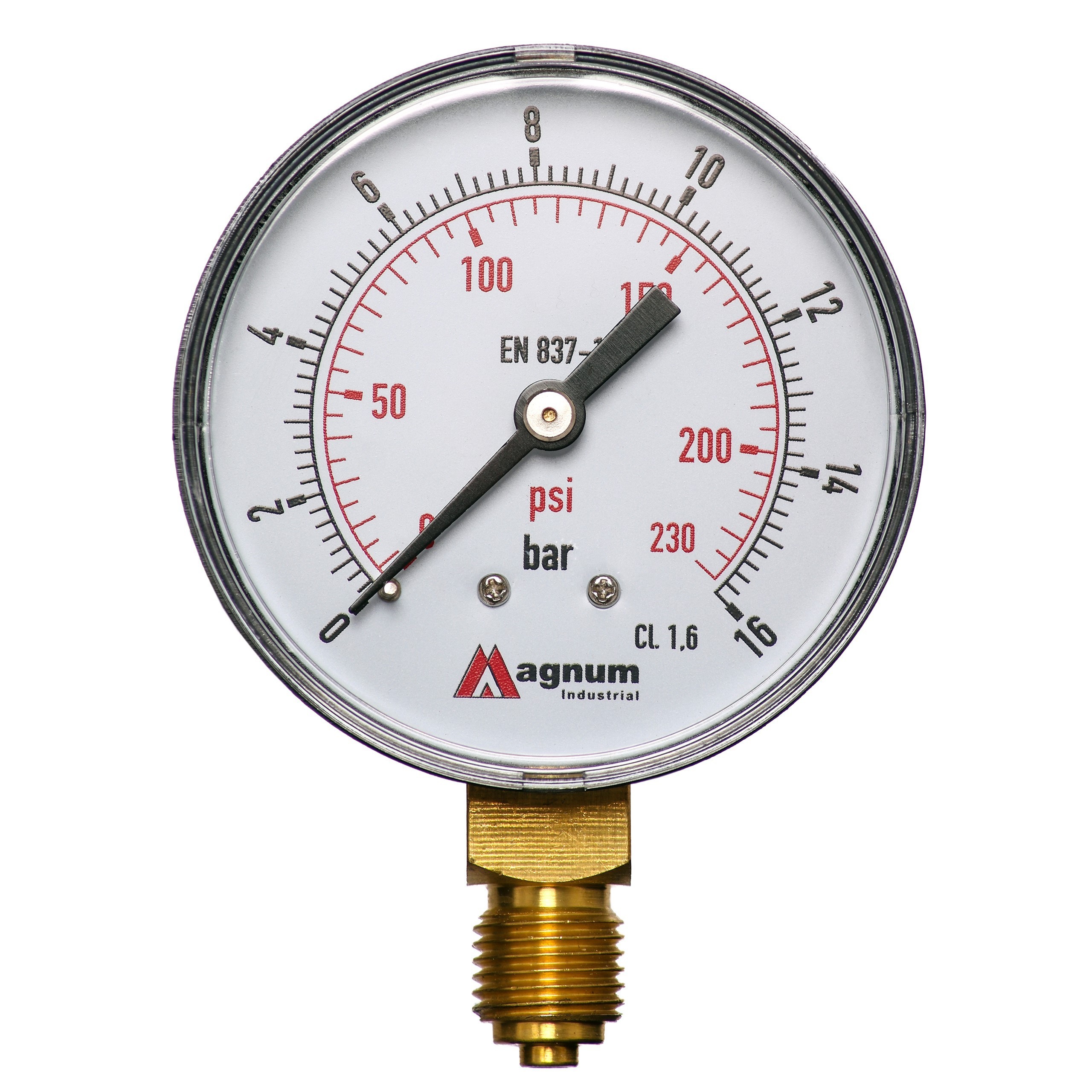 Wysokiej klasy manometr z rurką Bourdona marki MAGNUM wykonany zgodnie z normą EN 837-1 w klasie dokładności 1,6. Ciśnieniomierze ogólnego przeznaczenia do pomiaru ciśnienia gazów i cieczy chemicznie obojętnych na stopy miedzi i nie powodujących zatorów w układach ciśnienia.