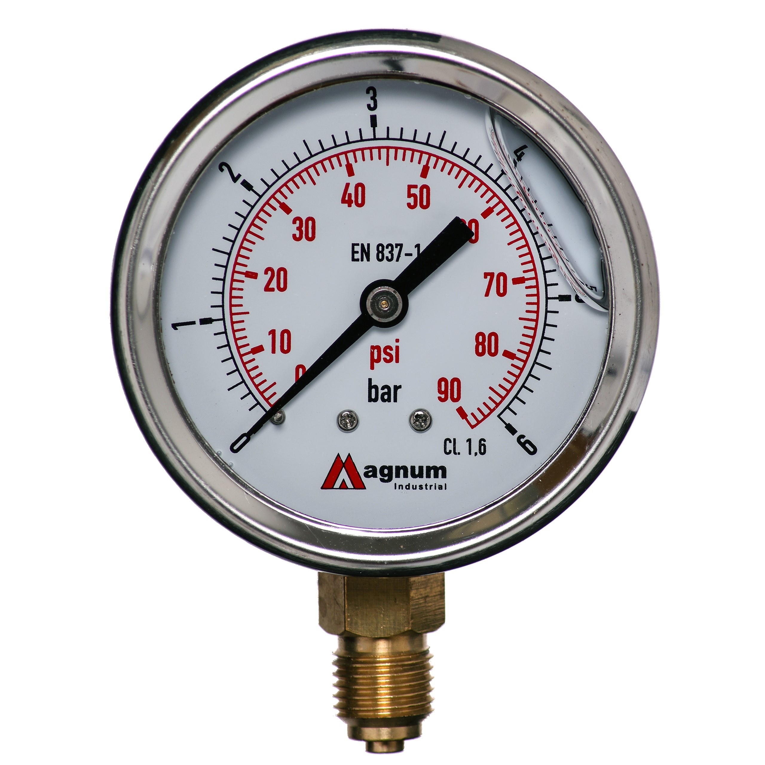 Wysokiej klasy manometr z rurką Bourdona marki MAGNUM wykonany zgodnie z normą EN 837-1 w klasie dokładności 1,6. Ciśnieniomierze ogólnego przeznaczenia do pomiaru ciśnienia gazów i cieczy chemicznie obojętnych na stopy miedzi i nie powodujących zatorów w układach ciśnienia.