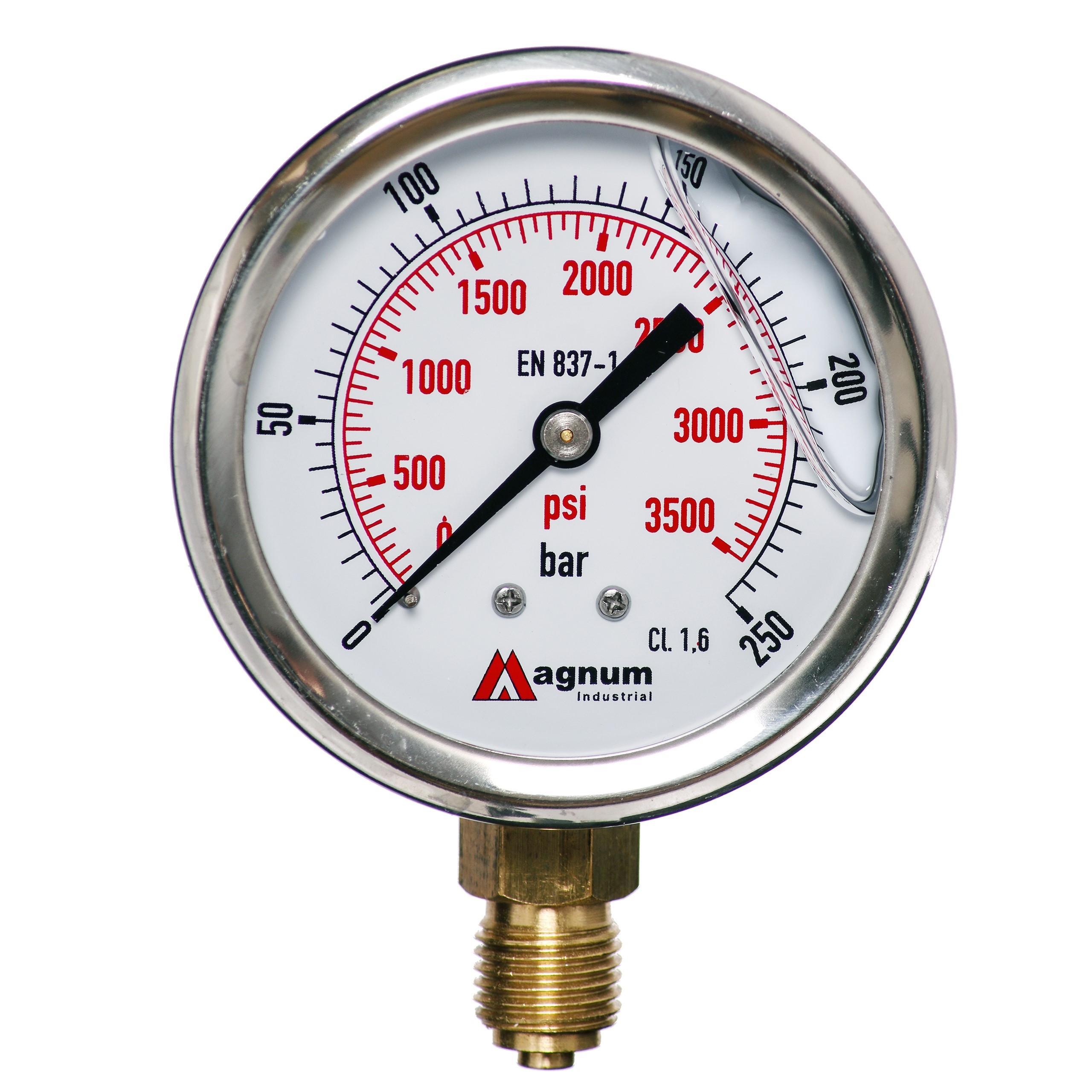 Wysokiej klasy manometr z rurką Bourdona marki MAGNUM wykonany zgodnie z normą EN 837-1 w klasie dokładności 1,6. Ciśnieniomierze ogólnego przeznaczenia do pomiaru ciśnienia gazów i cieczy chemicznie obojętnych na stopy miedzi i nie powodujących zatorów w układach ciśnienia.