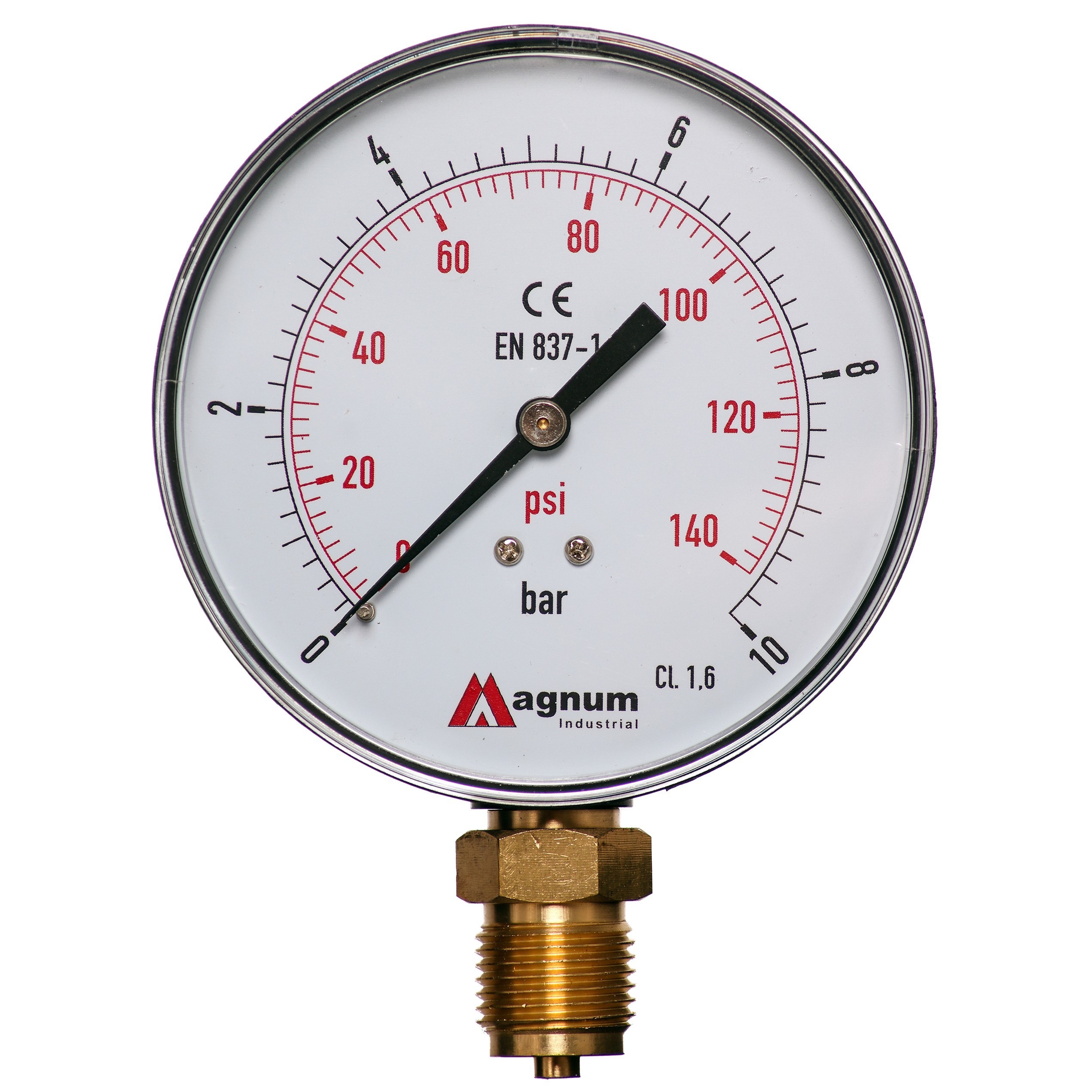 Wysokiej klasy manometr z rurką Bourdona marki MAGNUM wykonany zgodnie z normą EN 837-1 w klasie dokładności 1,6. Ciśnieniomierze ogólnego przeznaczenia do pomiaru ciśnienia gazów i cieczy chemicznie obojętnych na stopy miedzi i nie powodujących zatorów w układach ciśnienia.