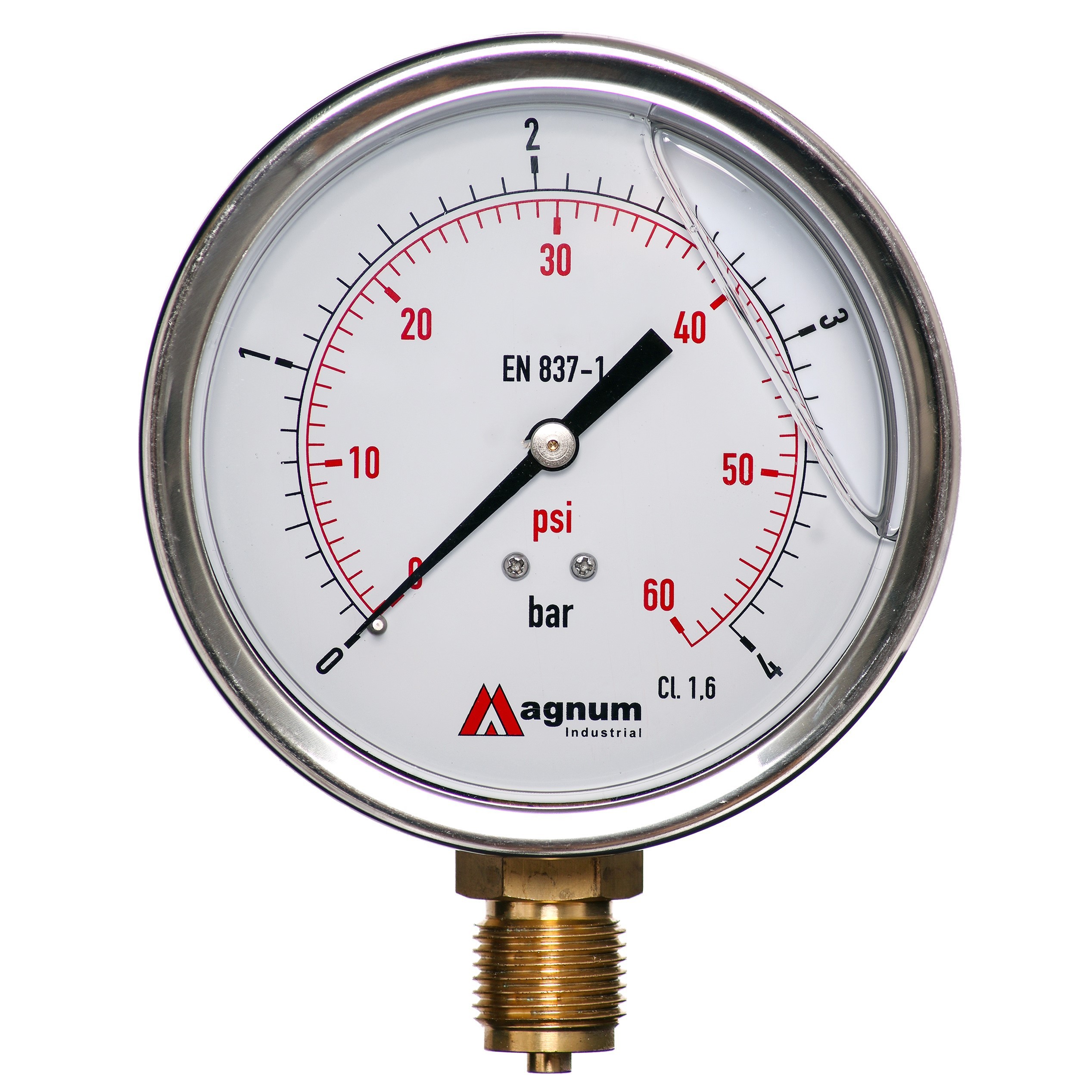 Wysokiej klasy manometr z rurką Bourdona marki MAGNUM wykonany zgodnie z normą EN 837-1 w klasie dokładności 1,6. Ciśnieniomierze ogólnego przeznaczenia do pomiaru ciśnienia gazów i cieczy chemicznie obojętnych na stopy miedzi i nie powodujących zatorów w układach ciśnienia.
