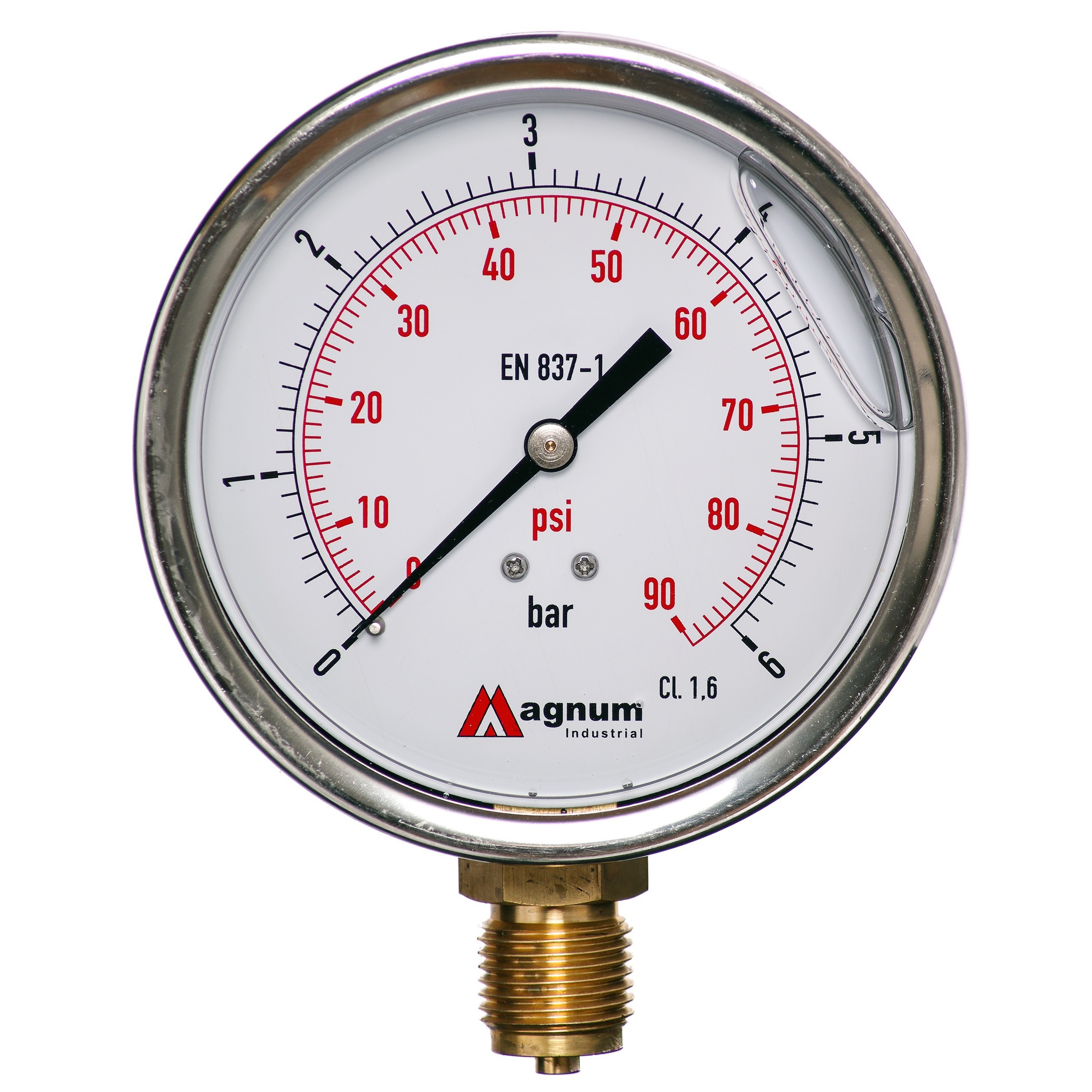 Wysokiej klasy manometr z rurką Bourdona marki MAGNUM wykonany zgodnie z normą EN 837-1 w klasie dokładności 1,6. Ciśnieniomierze ogólnego przeznaczenia do pomiaru ciśnienia gazów i cieczy chemicznie obojętnych na stopy miedzi i nie powodujących zatorów w układach ciśnienia.