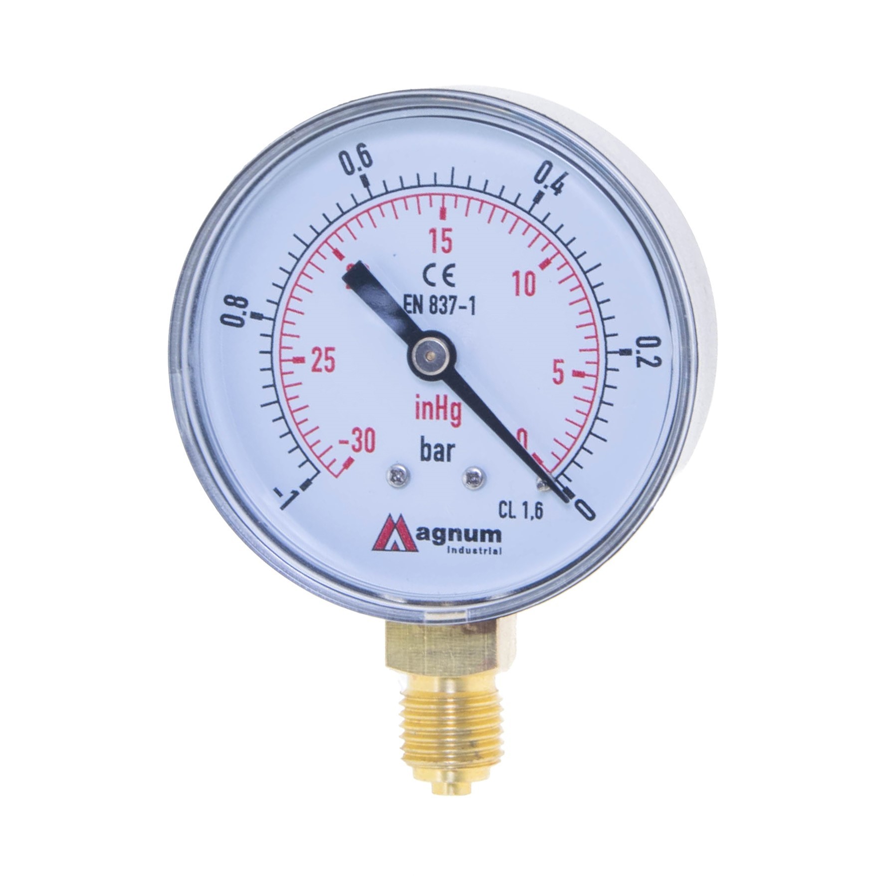Wysokiej klasy wakuometr z rurką Bourdona marki MAGNUM wykonany zgodnie z normą EN 837-1 w klasie dokładności 1,6. Ciśnieniomierze ogólnego przeznaczenia do pomiarów podciśnienia gazów oraz cieczy chemicznie obojętnych na stopy miedzi które nie powodują zatorów w układach ciśnienia.