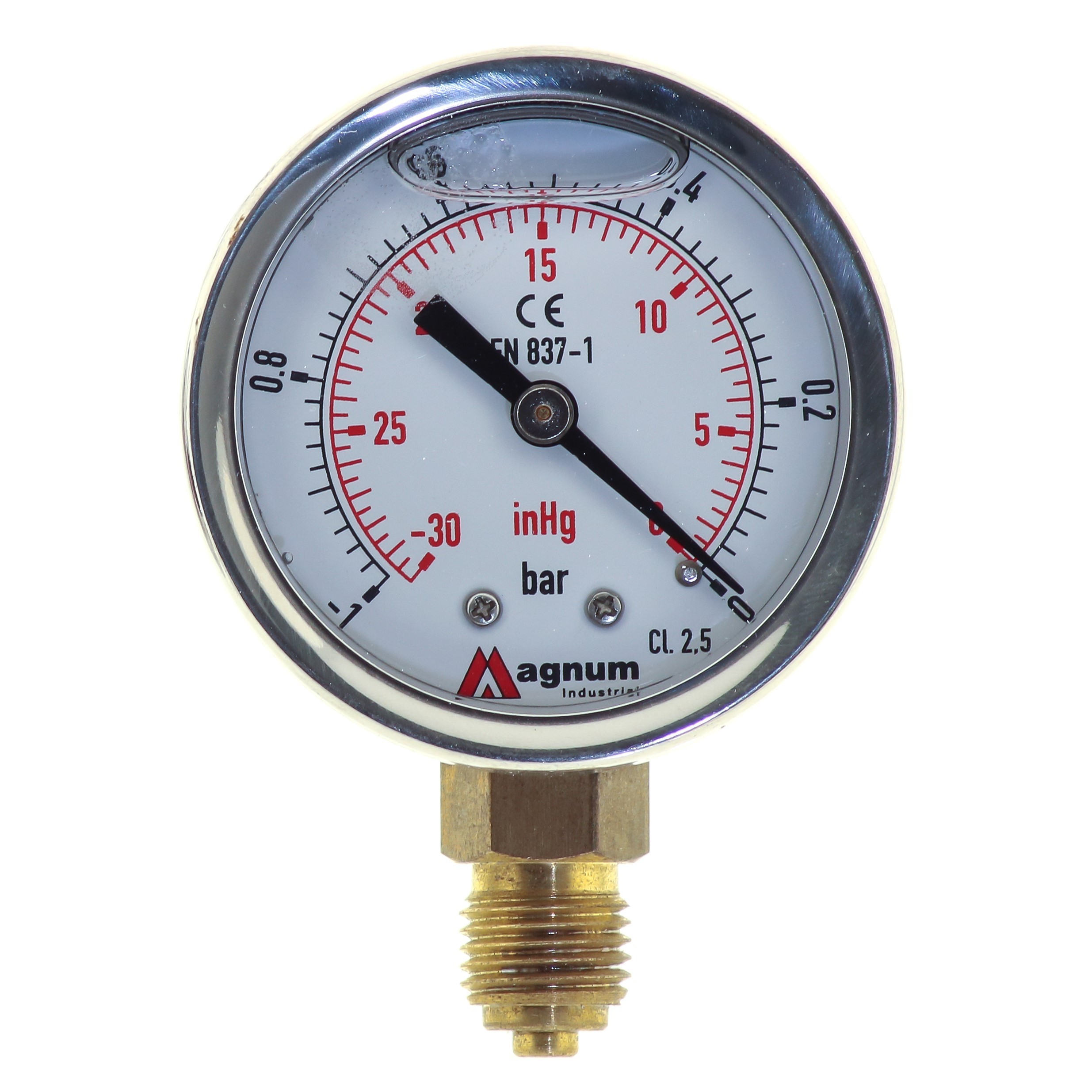 Wysokiej klasy wakuometr z rurką Bourdona marki MAGNUM wykonany zgodnie z normą EN 837-1 w klasie dokładności 2,5. Ciśnieniomierze ogólnego przeznaczenia do pomiarów podciśnienia gazów oraz cieczy chemicznie obojętnych na stopy miedzi które nie powodują zatorów w układach ciśnienia.