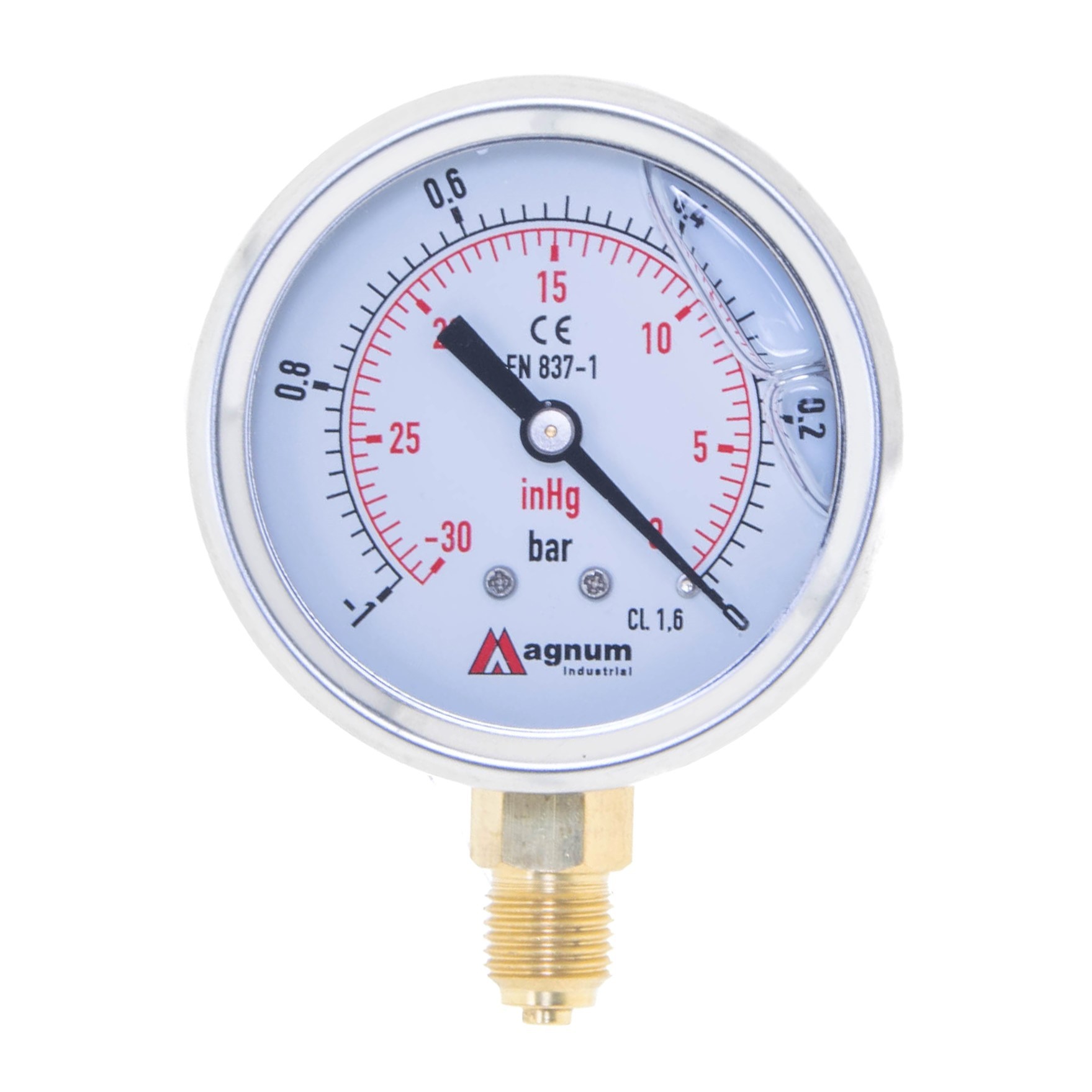 Wysokiej klasy wakuometr z rurką Bourdona marki MAGNUM wykonany zgodnie z normą EN 837-1 w klasie dokładności 1,6. Ciśnieniomierze ogólnego przeznaczenia do pomiarów podciśnienia gazów oraz cieczy chemicznie obojętnych na stopy miedzi które nie powodują zatorów w układach ciśnienia.