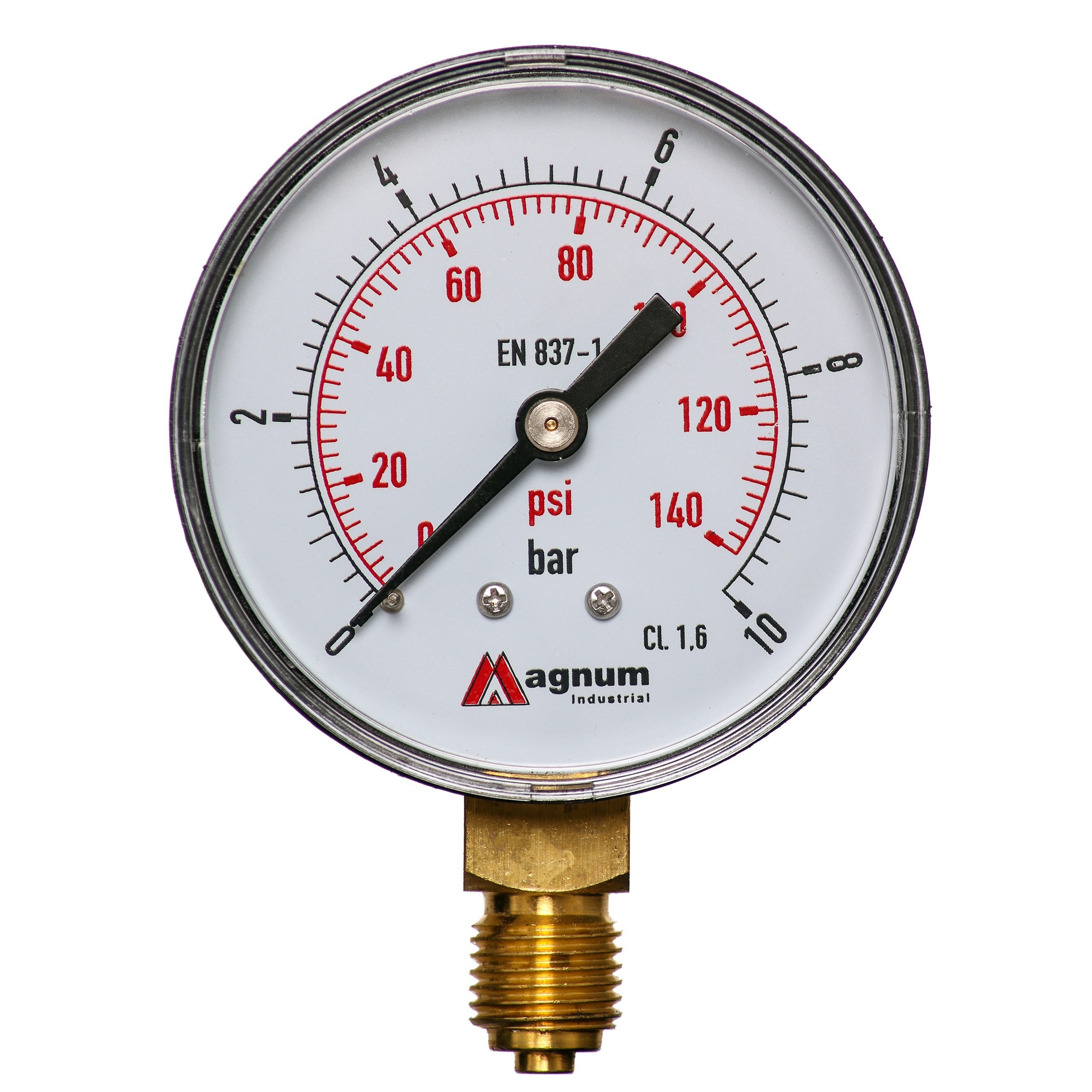 Wysokiej klasy manometr z rurką Bourdona marki MAGNUM wykonany zgodnie z normą EN 837-1 w klasie dokładności 1,6. Ciśnieniomierze ogólnego przeznaczenia do pomiaru ciśnienia gazów i cieczy chemicznie obojętnych na stopy miedzi i nie powodujących zatorów w układach ciśnienia.