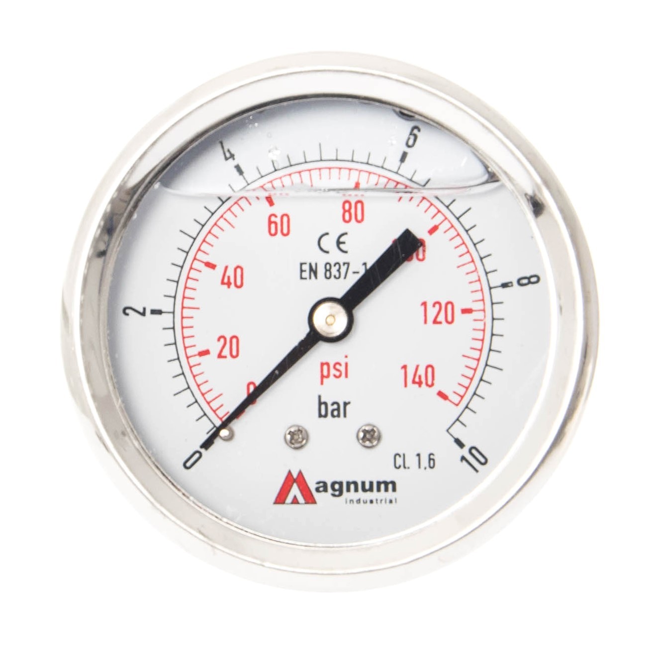 Wysokiej klasy manometr z rurką Bourdona marki MAGNUM wykonany zgodnie z normą EN 837-1 w klasie dokładności 1,6. Ciśnieniomierze ogólnego przeznaczenia do pomiaru ciśnienia gazów i cieczy chemicznie obojętnych na stopy miedzi i nie powodujących zatorów w układach ciśnienia.