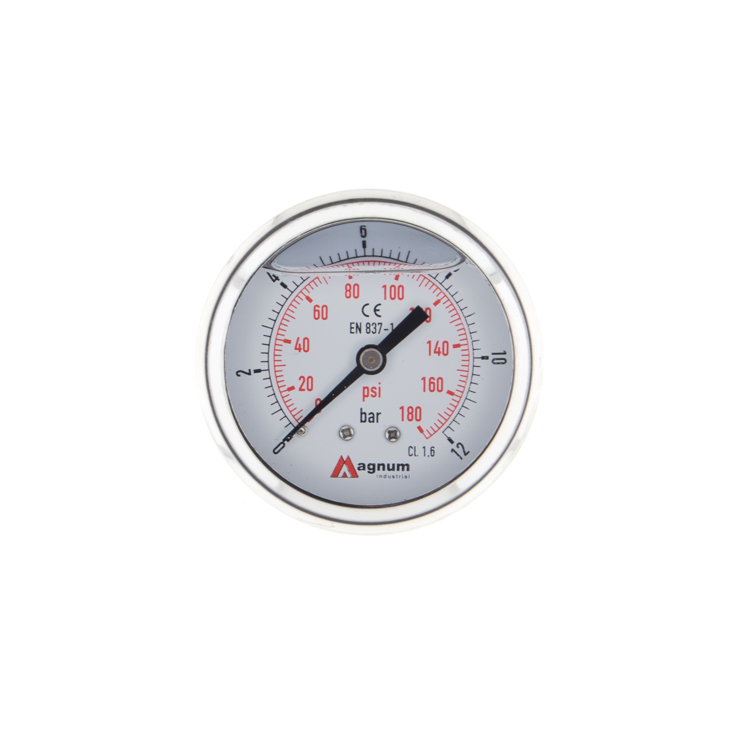 Wysokiej klasy manometr z rurką Bourdona marki MAGNUM wykonany zgodnie z normą EN 837-1 w klasie dokładności 1,6. Ciśnieniomierze ogólnego przeznaczenia do pomiaru ciśnienia gazów i cieczy chemicznie obojętnych na stopy miedzi i nie powodujących zatorów w układach ciśnienia.