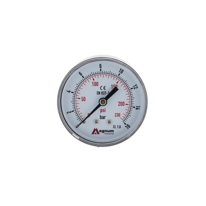 Wysokiej klasy manometr z rurką Bourdona marki MAGNUM wykonany zgodnie z normą EN 837-1 w klasie dokładności 1,6. Ciśnieniomierze ogólnego przeznaczenia do pomiaru ciśnienia gazów i cieczy chemicznie obojętnych na stopy miedzi i nie powodujących zatorów w układach ciśnienia.