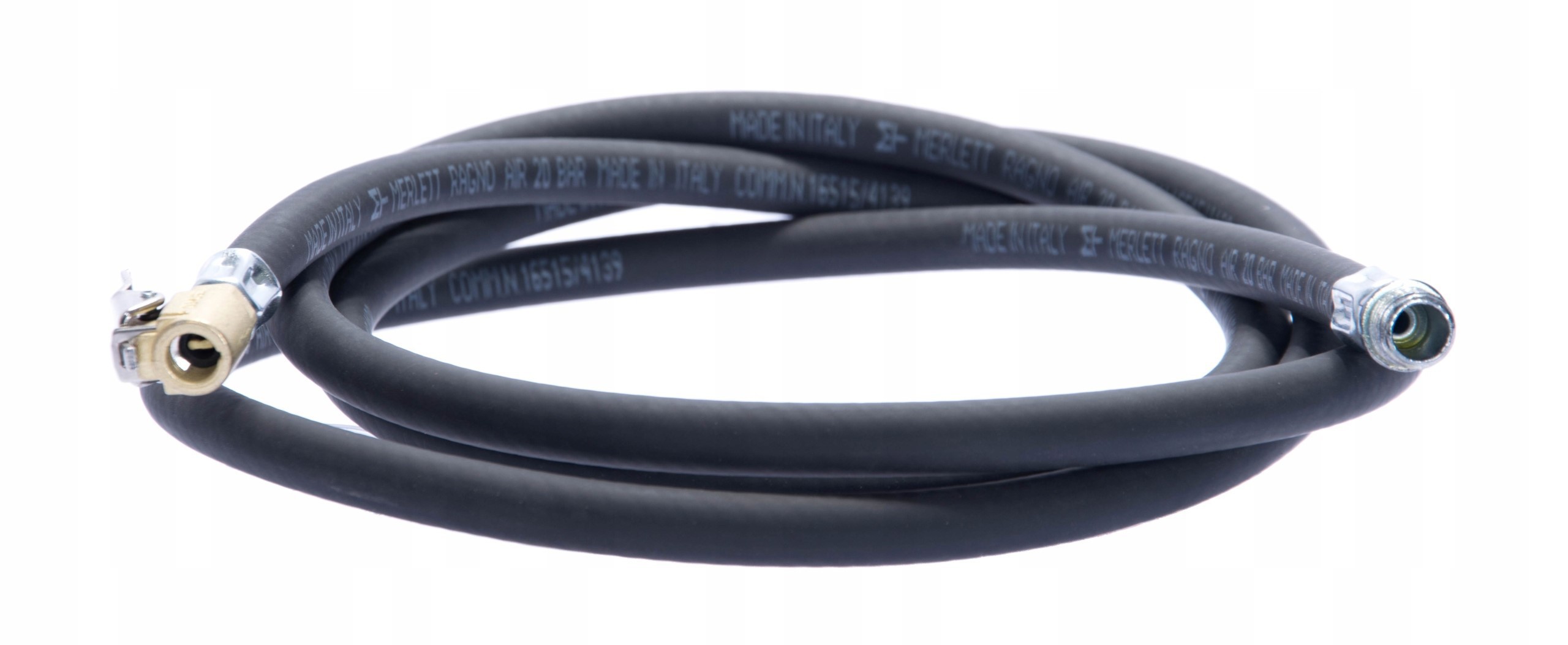 Wysokiej jakości włoski przewód gumowy do pompowania zakuty w standardową końcówkę do pompowania, która pasuje do większości wentyli samochodowych, motocyklowych i rowerowych. Wężyk zakończony gwintem zewnętrznym 1/4".