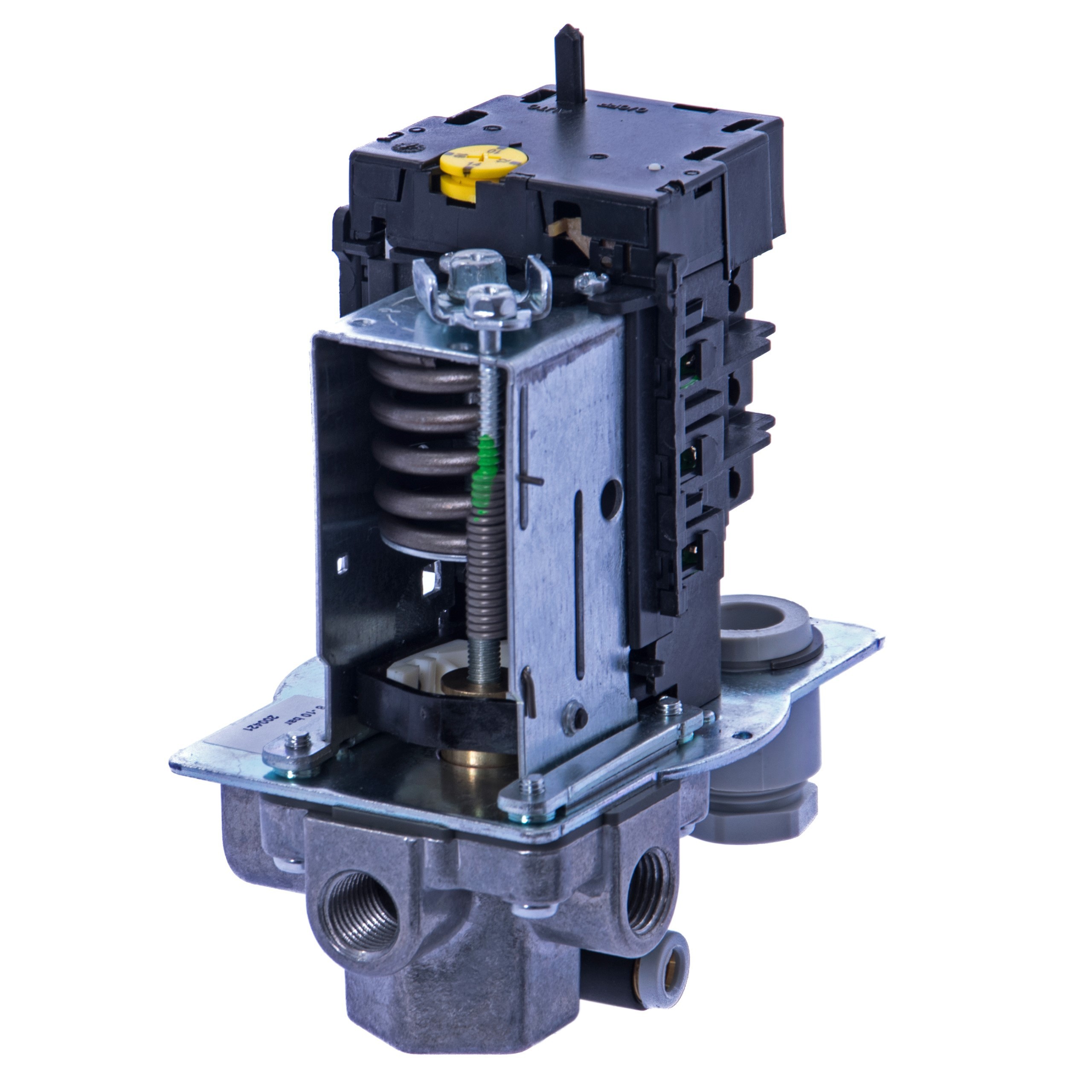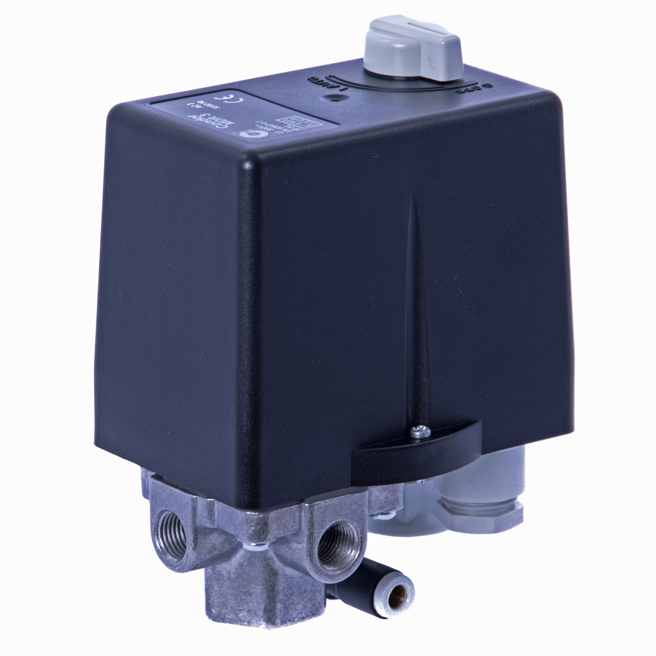 Przełącznik ciśnieniowy marki CONDOR, używany do utrzymywania ciśnienia w zbiorniku kompresora pomiędzy zadaną górną i dolną wartością ciśnienia. Sterownik przeznaczony do silników trójfazowych.