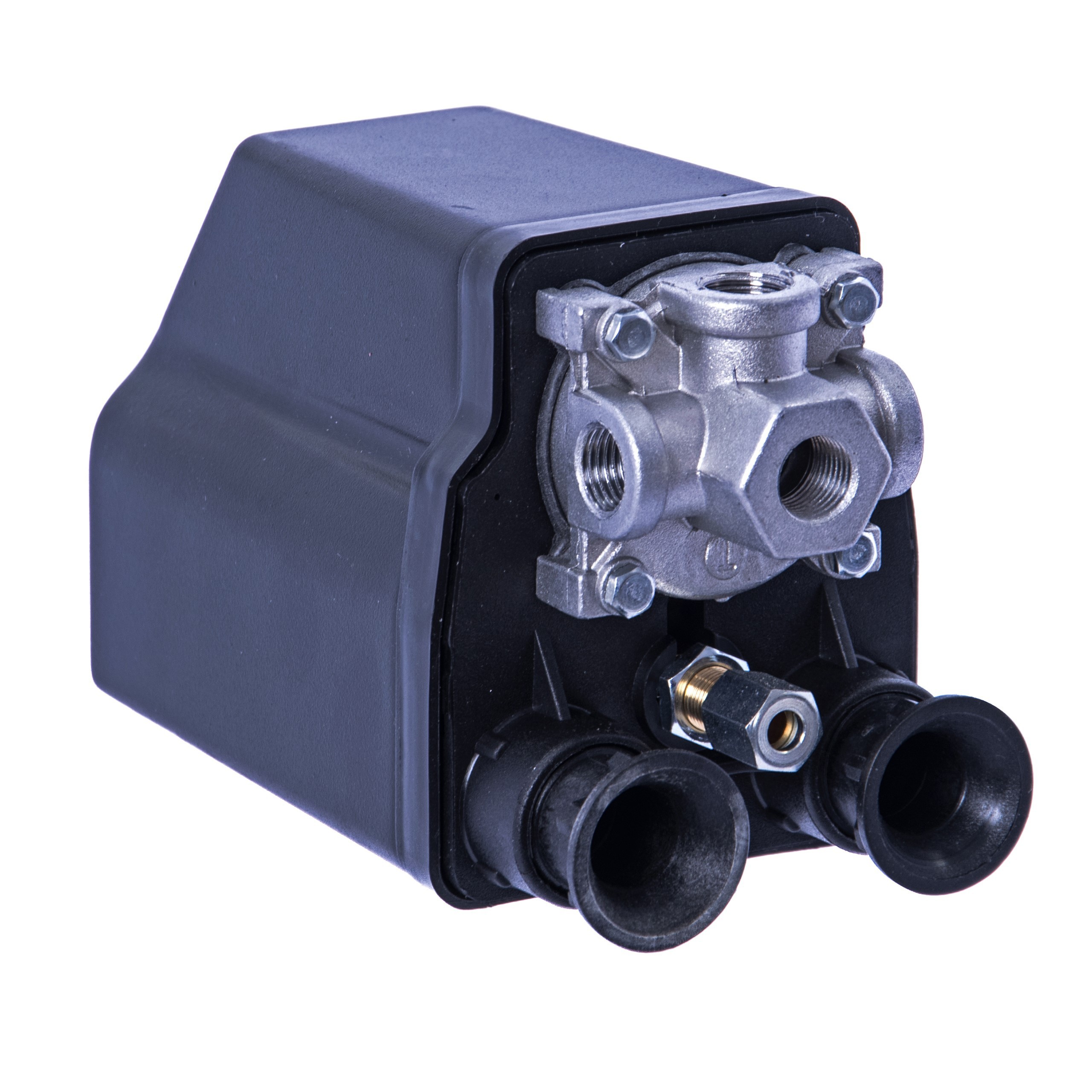 Presostat posiada cztery przyłącza wewnętrzne. Dolny gwint do zamocowania na zbiorniku kompresora i boczne gwinty do których można zamocować dodatkowe elementy według własnego zapotrzebowania - np. manometr, szybkozłącza, reduktor, zawór bezpieczeństwa.