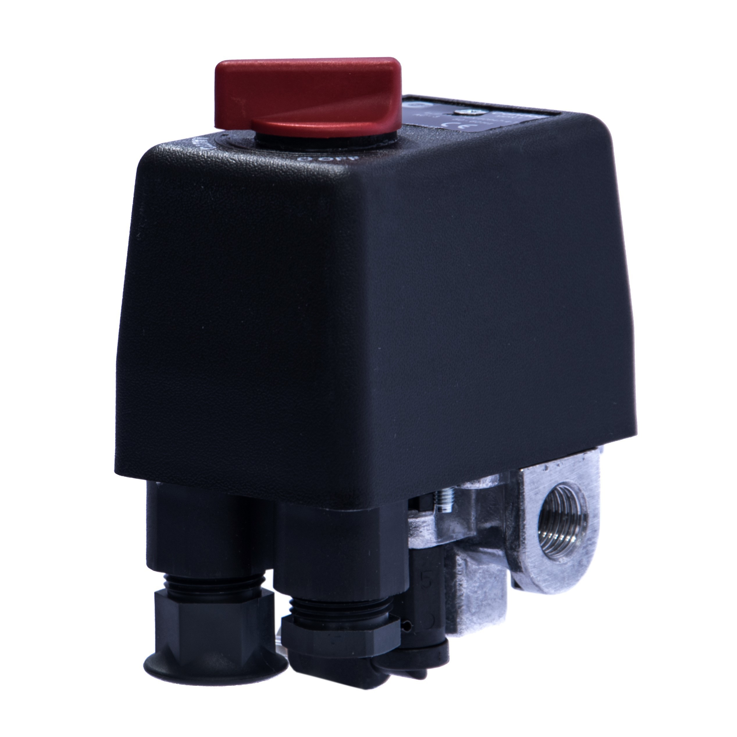 Presostat posiada cztery przyłącza wewnętrzne. Dolny gwint do zamocowania na zbiorniku kompresora i boczne gwinty do których można zamocować dodatkowe elementy według własnego zapotrzebowania - np. manometr, szybkozłącza, reduktor, zawór bezpieczeństwa.