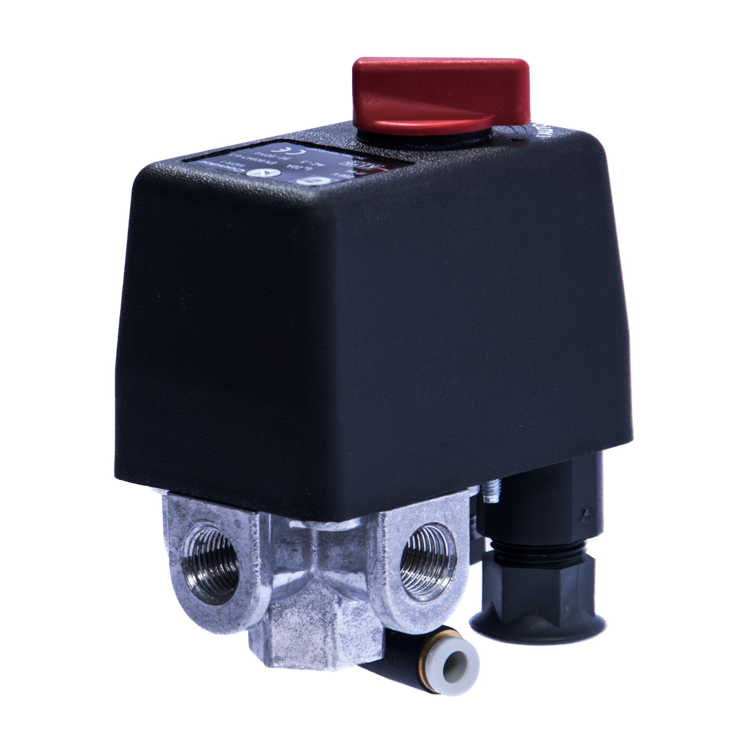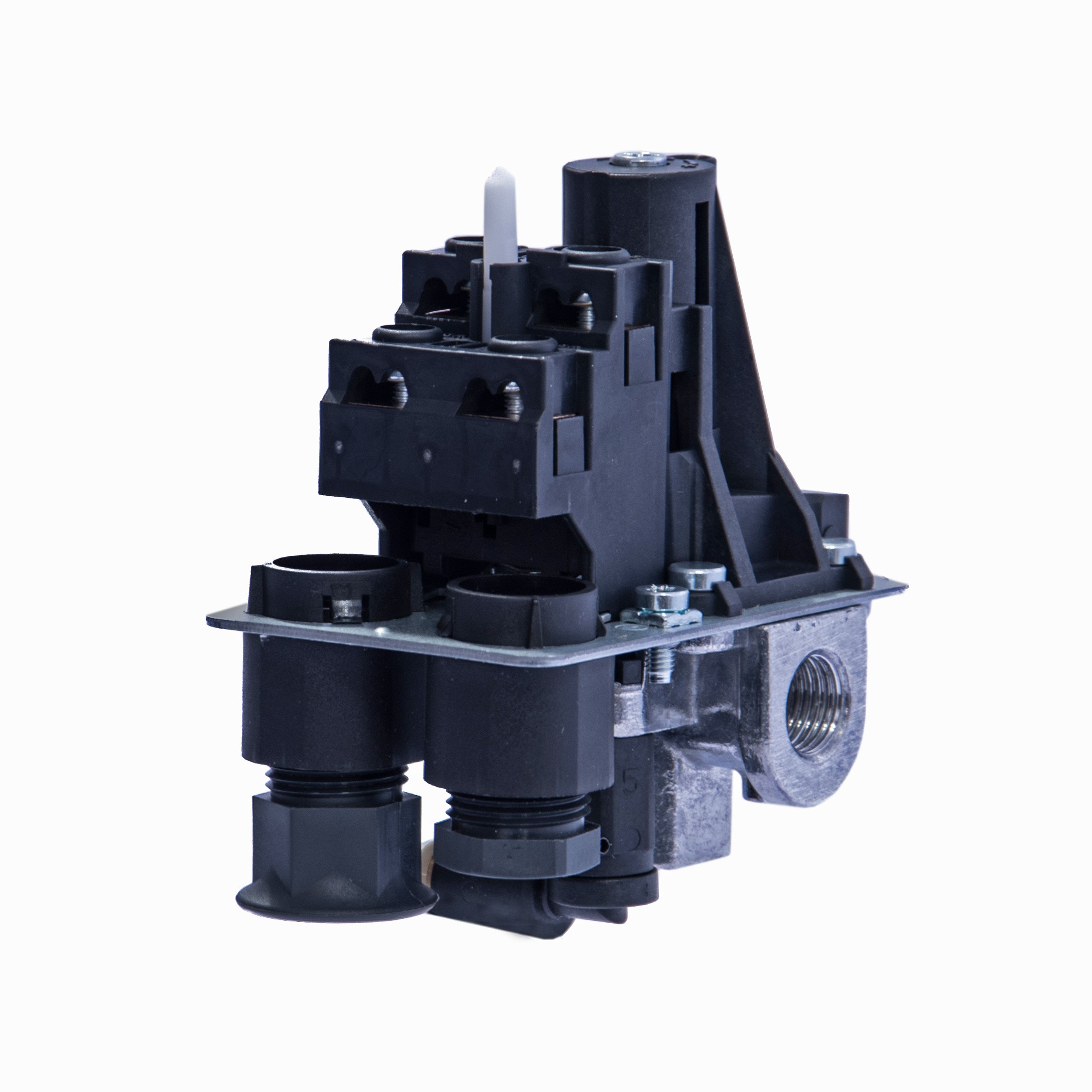 Przełącznik ciśnieniowy marki CONDOR, używany do utrzymywania ciśnienia w zbiorniku kompresora pomiędzy zadaną górną i dolną wartością ciśnienia. Sterownik przeznaczony do silników jednofazowych.