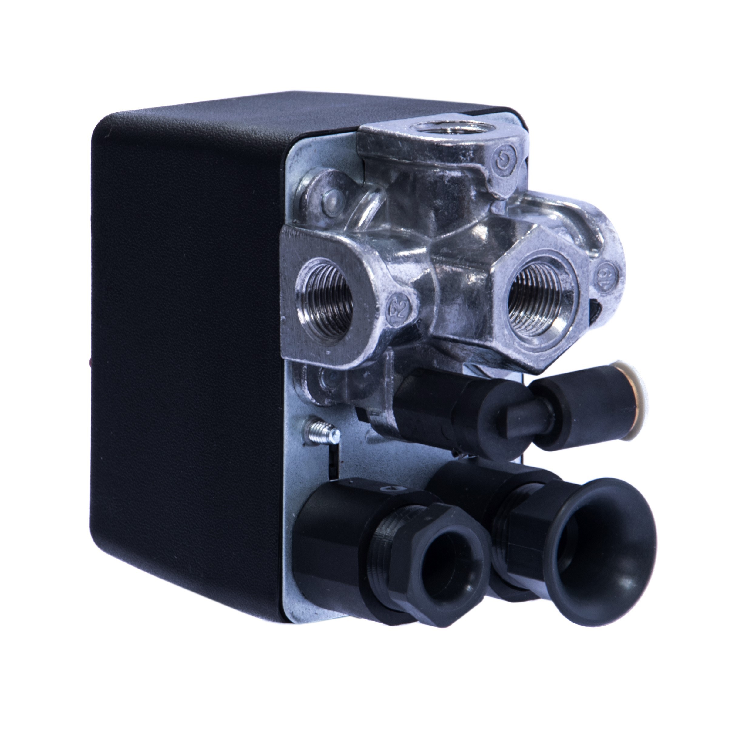 Presostat posiada cztery przyłącza wewnętrzne. Dolny gwint do zamocowania na zbiorniku kompresora i boczne gwinty do których można zamocować dodatkowe elementy według własnego zapotrzebowania - np. manometr, szybkozłącza, reduktor, zawór bezpieczeństwa.