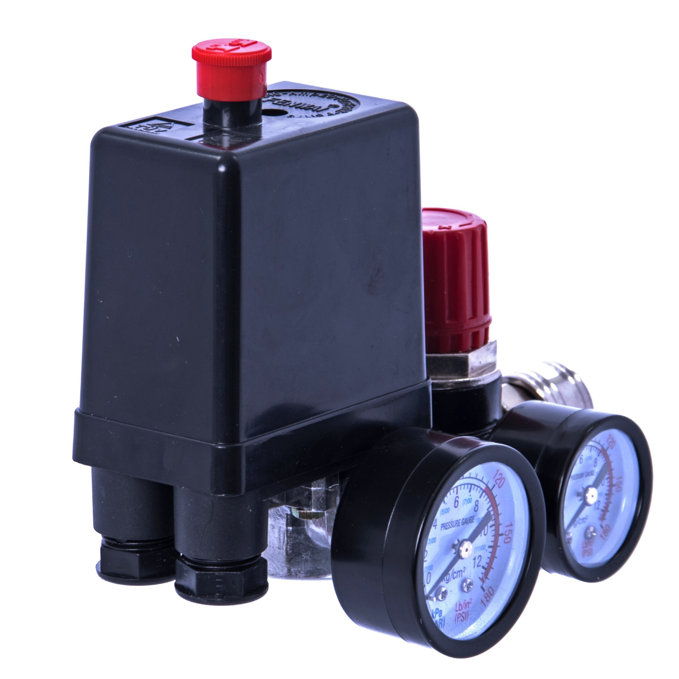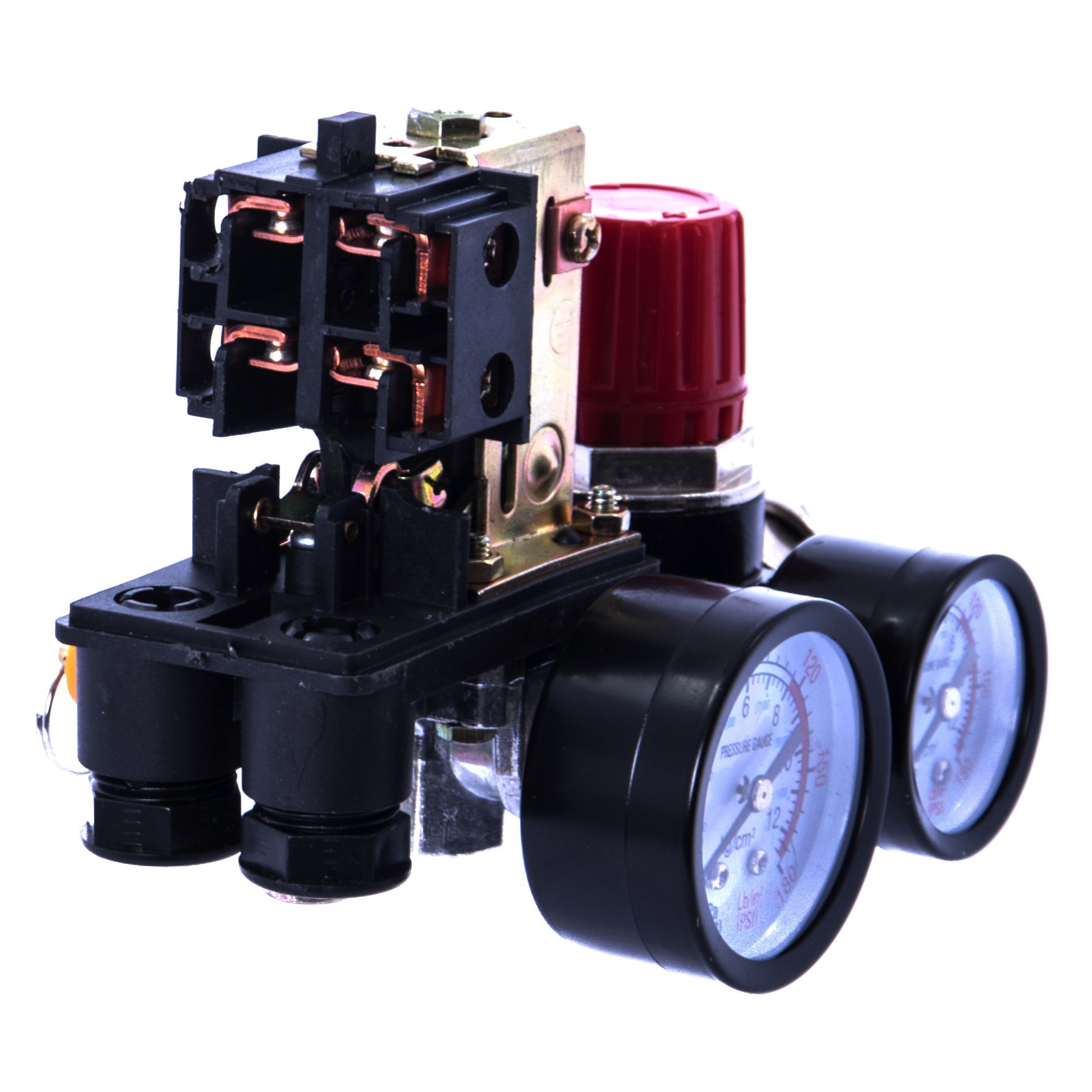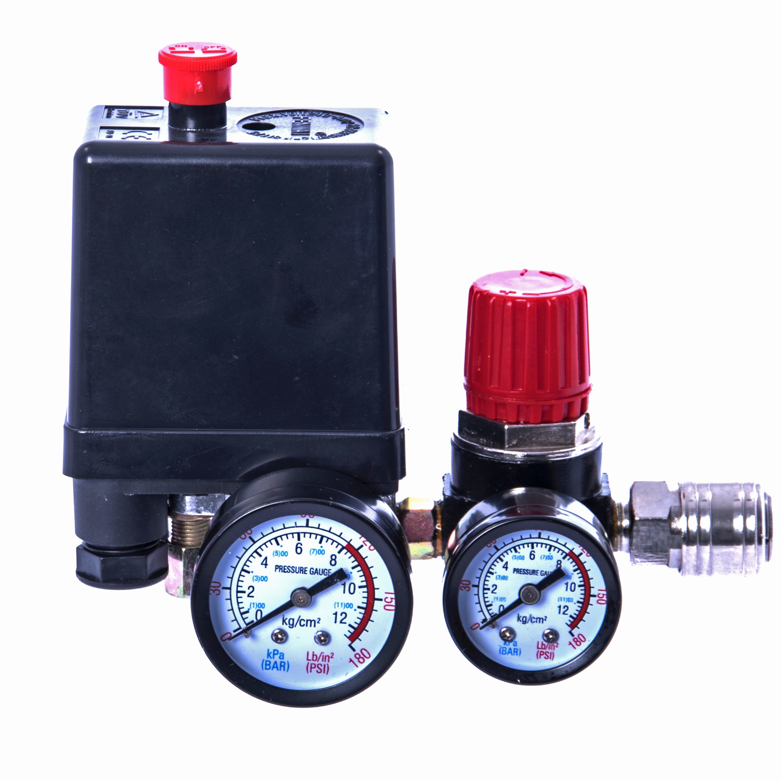 Przełącznik ciśnieniowy marki MAGNUM, używany do utrzymywania ciśnienia w zbiorniku kompresora pomiędzy zadaną górną i dolną wartością ciśnienia. Sterownik przeznaczony do silników jednofazowych.
