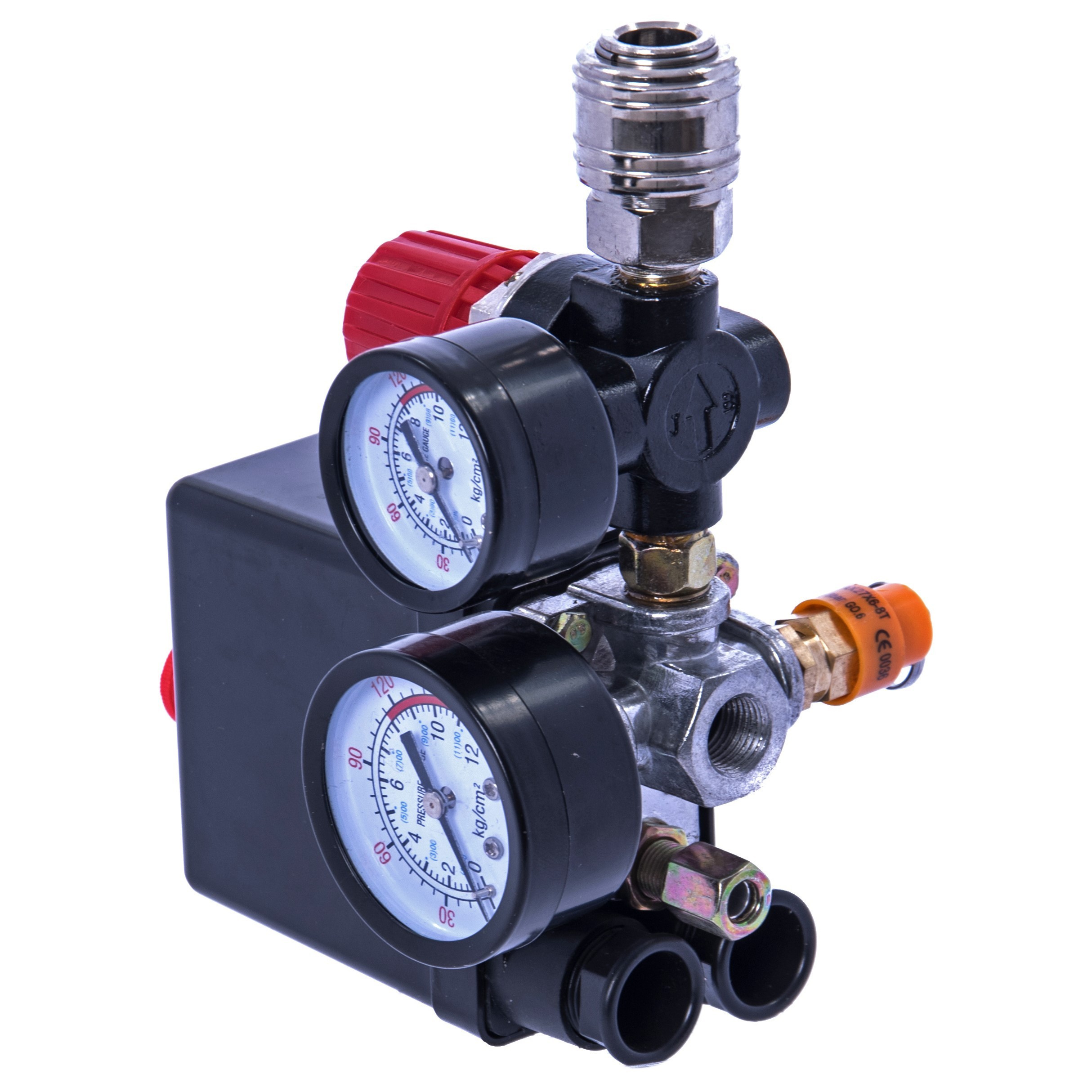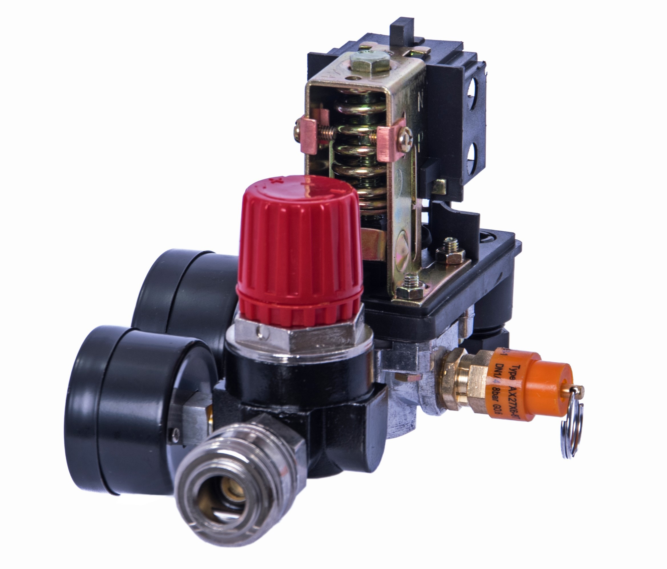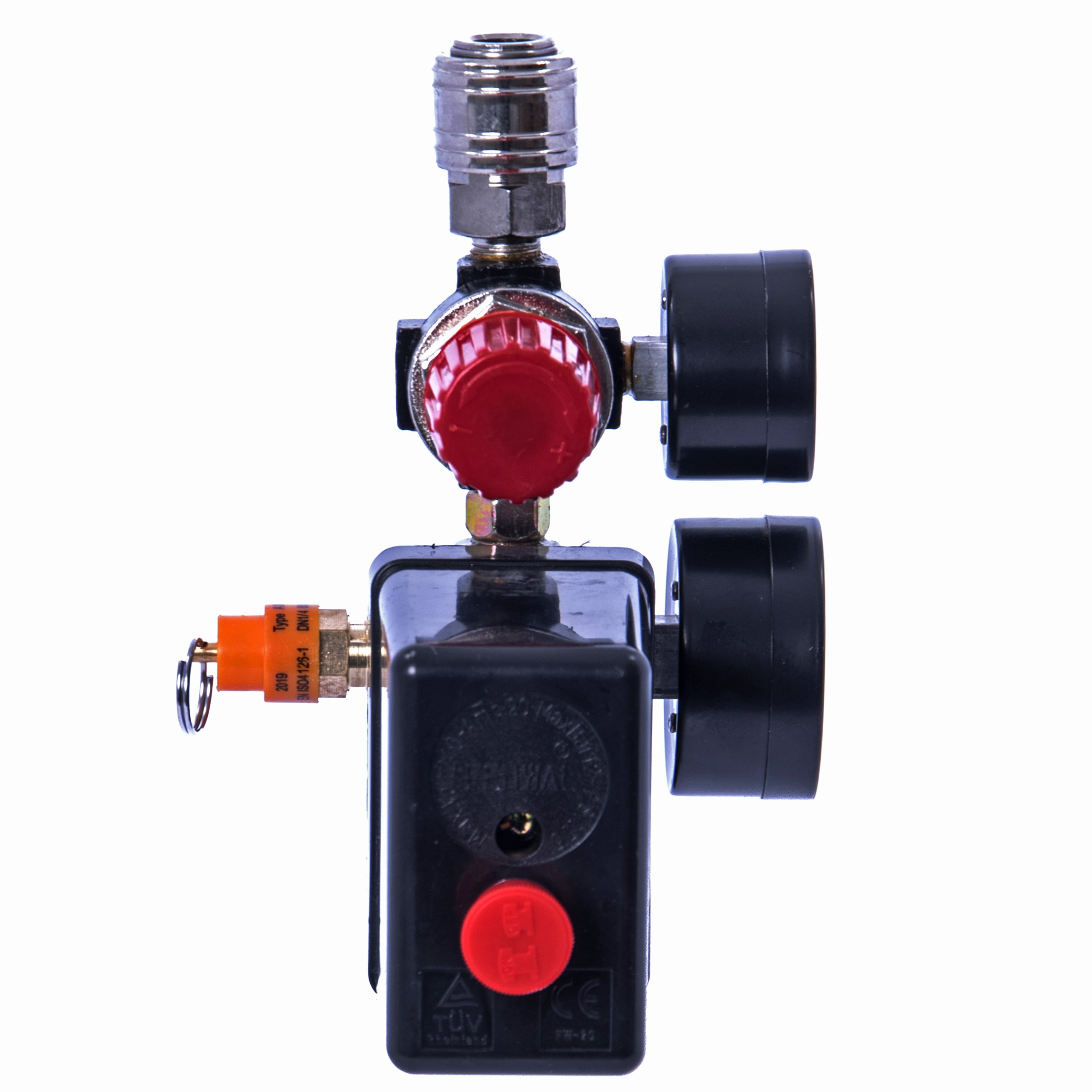 Presostat wyposażony w reduktor z szybkozłączem, służący do regulacji ciśnienia wyjściowego oraz zawór bezpieczeństwa zapobiegający przekroczeniu maksymalnego ciśnienia w zbiorniku.