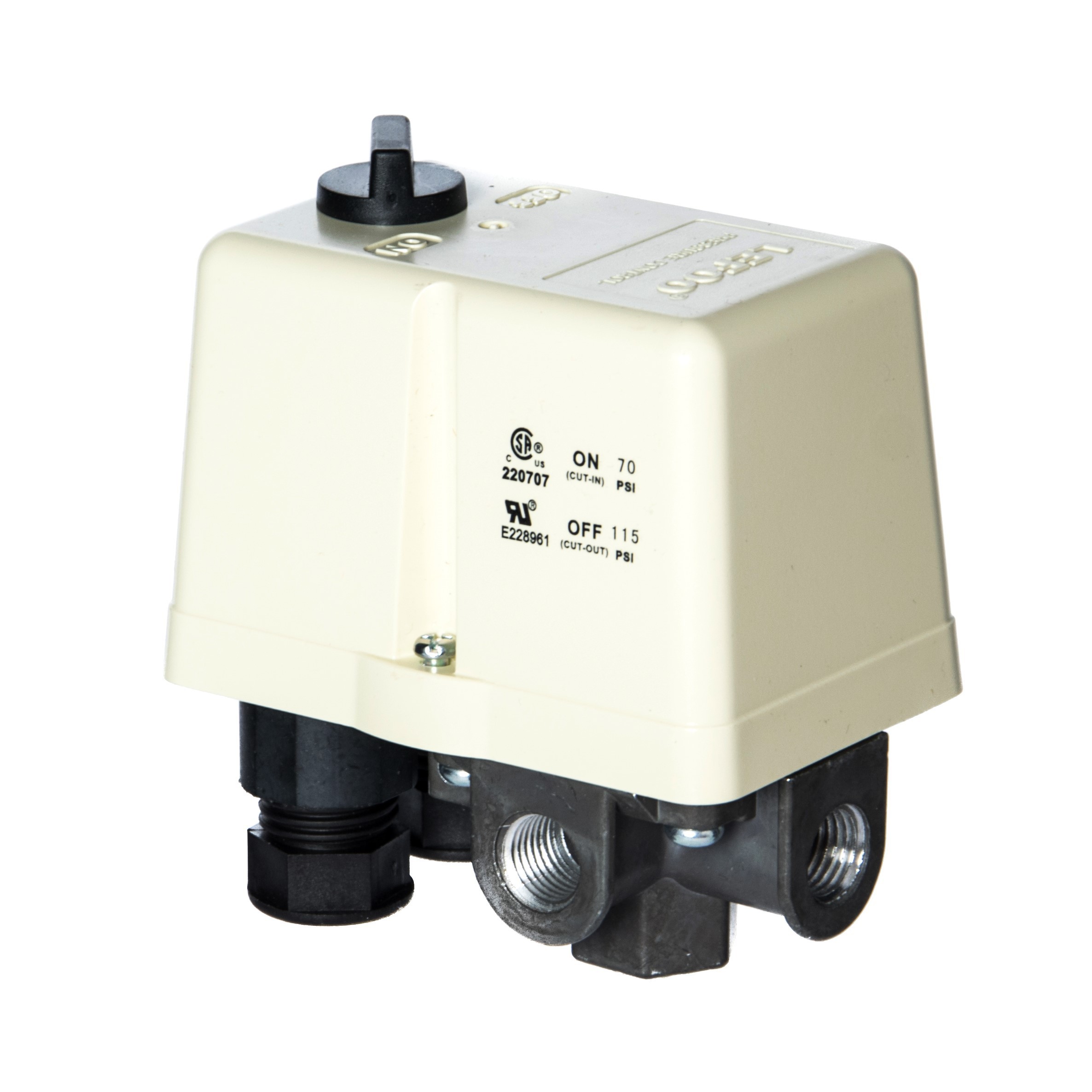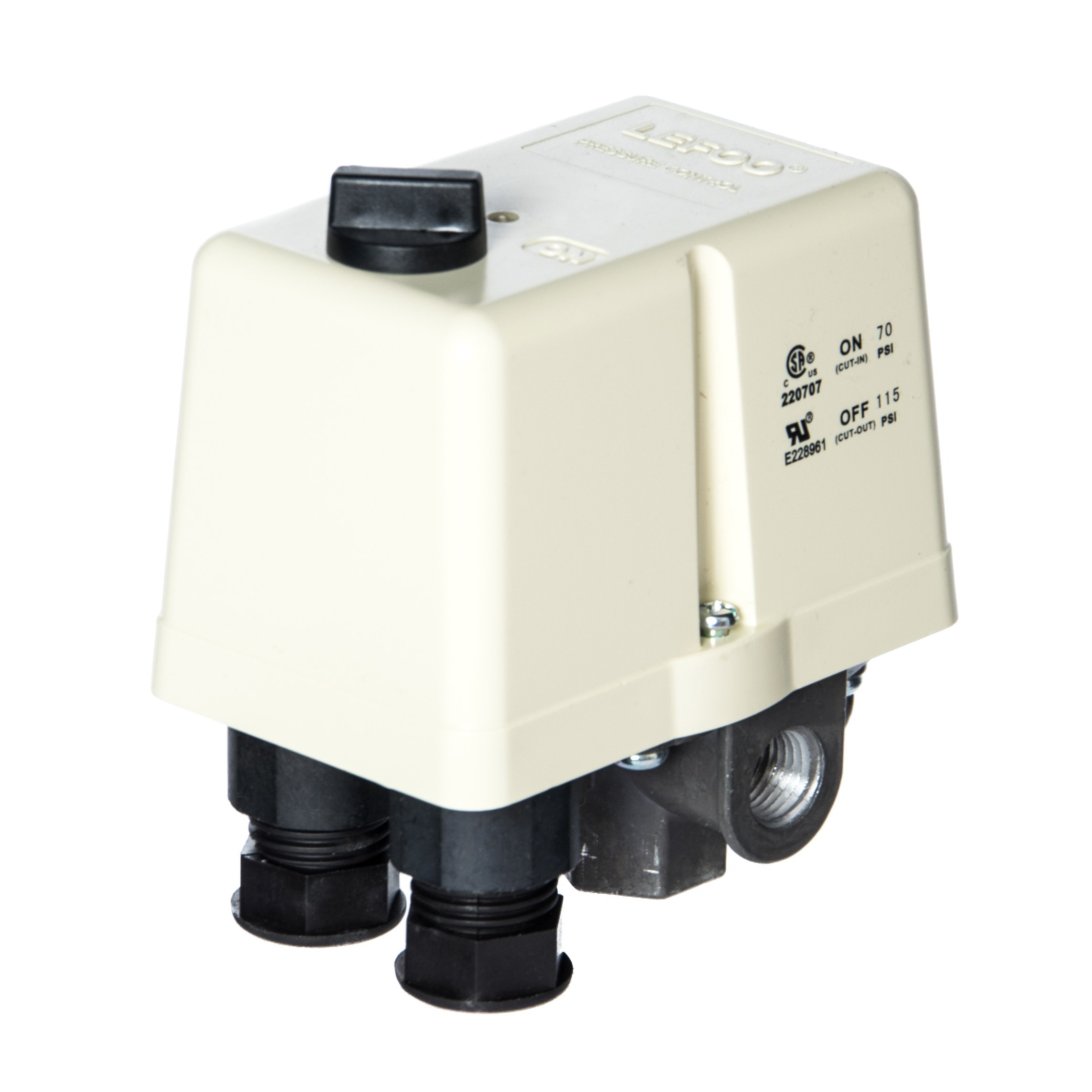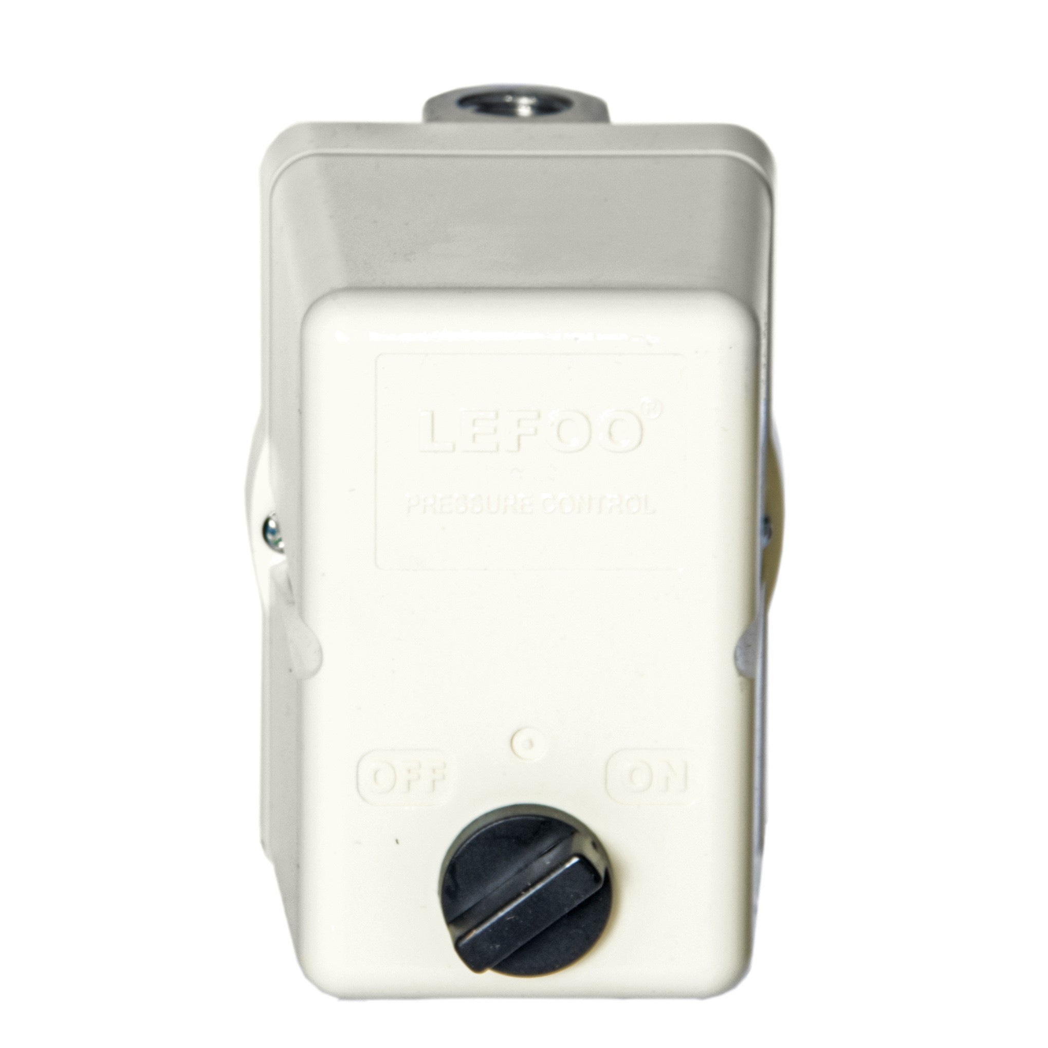 Przełącznik ciśnieniowy marki LEFOO, używany do utrzymywania ciśnienia w zbiorniku kompresora pomiędzy zadaną górną i dolną wartością ciśnienia. Sterownik przeznaczony do silników jednofazowych.