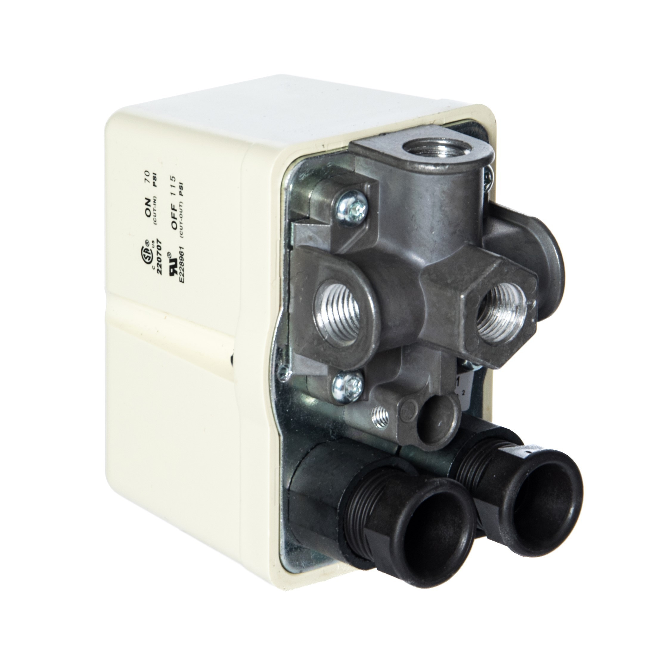 Presostat posiada cztery przyłącza wewnętrzne. Dolny gwint do zamocowania na zbiorniku kompresora i boczne gwinty do których można zamocować dodatkowe elementy według własnego zapotrzebowania - np. manometr, szybkozłącza, reduktor, zawór bezpieczeństwa.