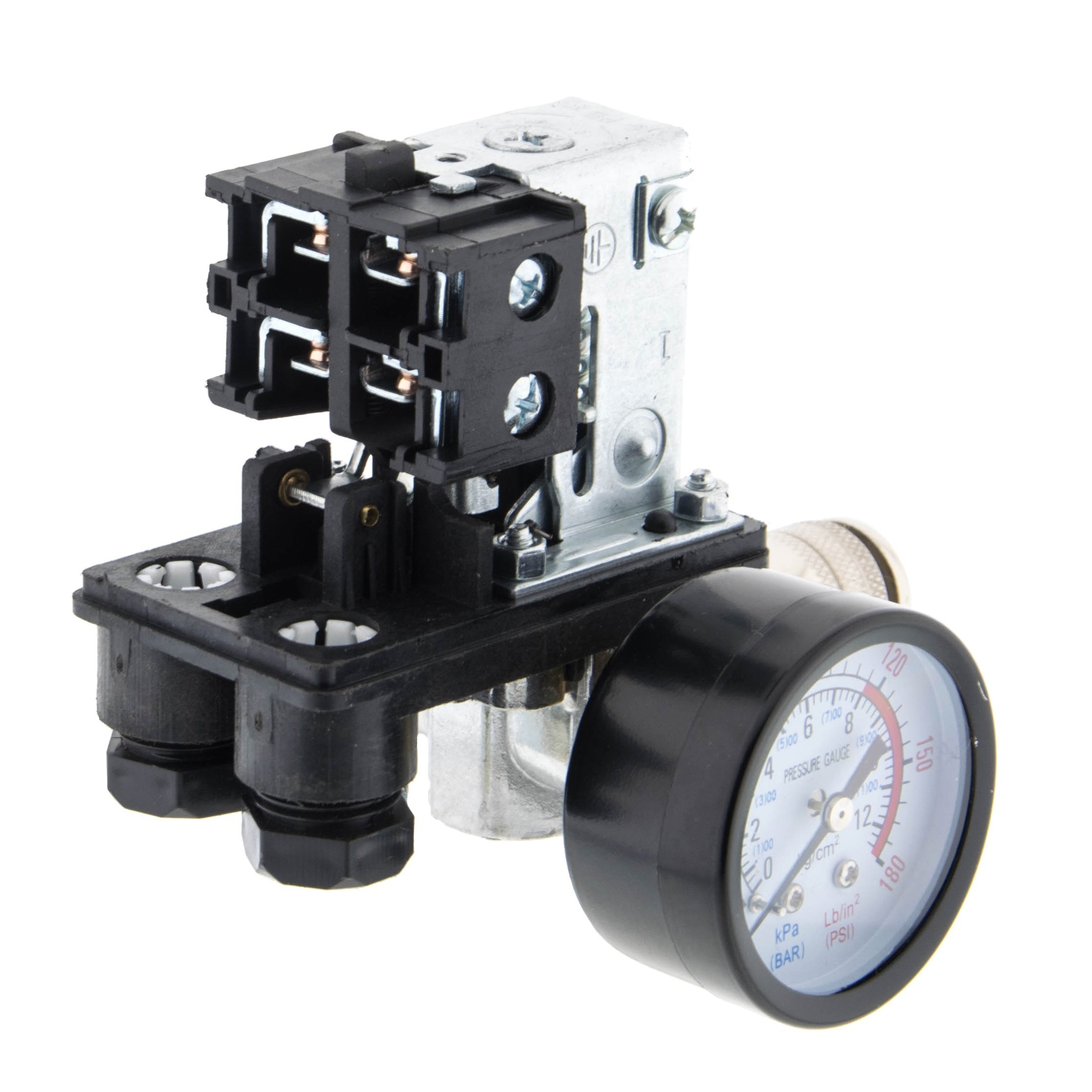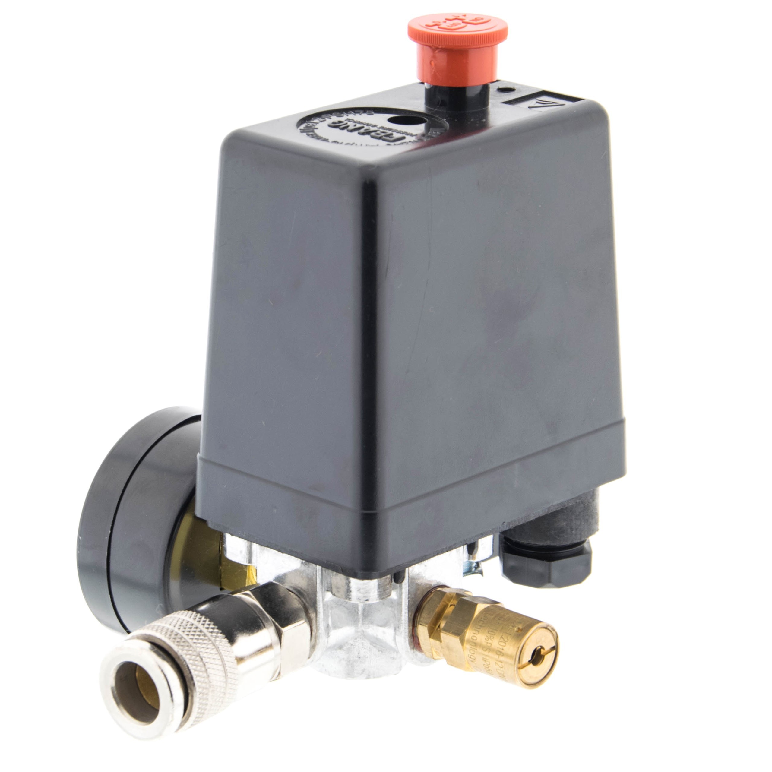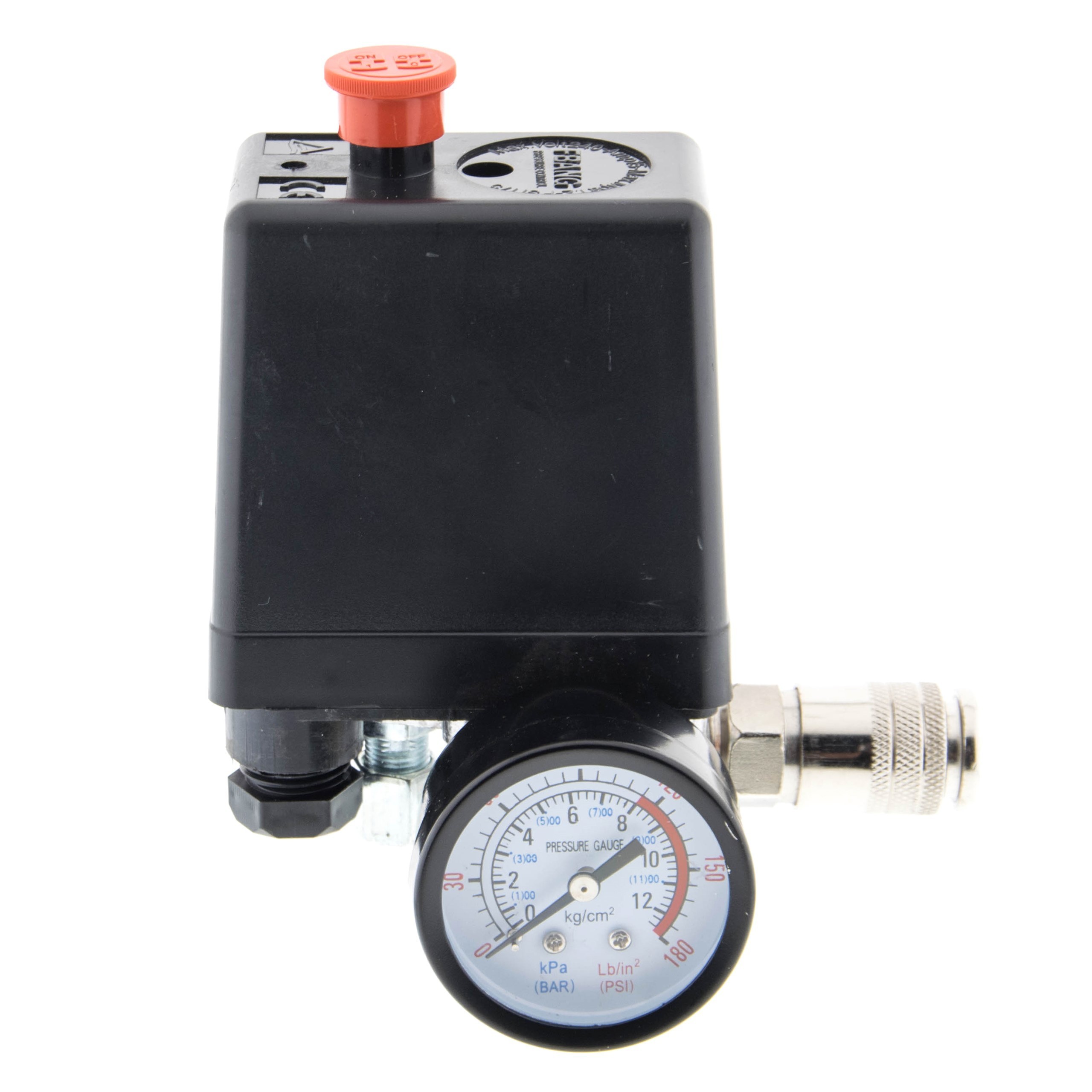 Przełącznik ciśnieniowy marki MAGNUM, używany do utrzymywania ciśnienia w zbiorniku kompresora pomiędzy zadaną górną i dolną wartością ciśnienia. Sterownik przeznaczony do silników jednofazowych.