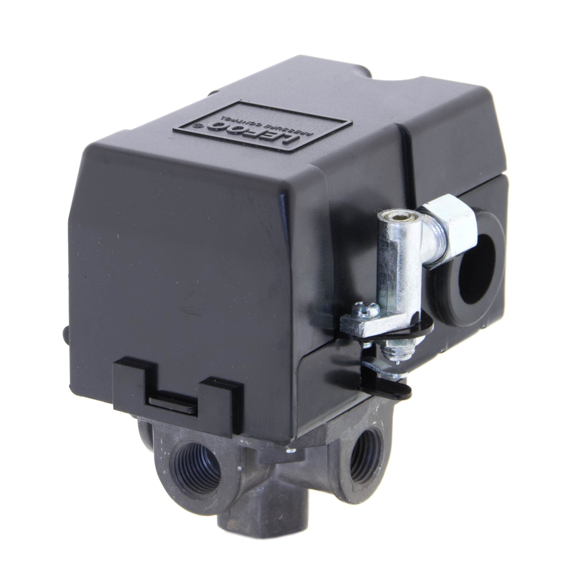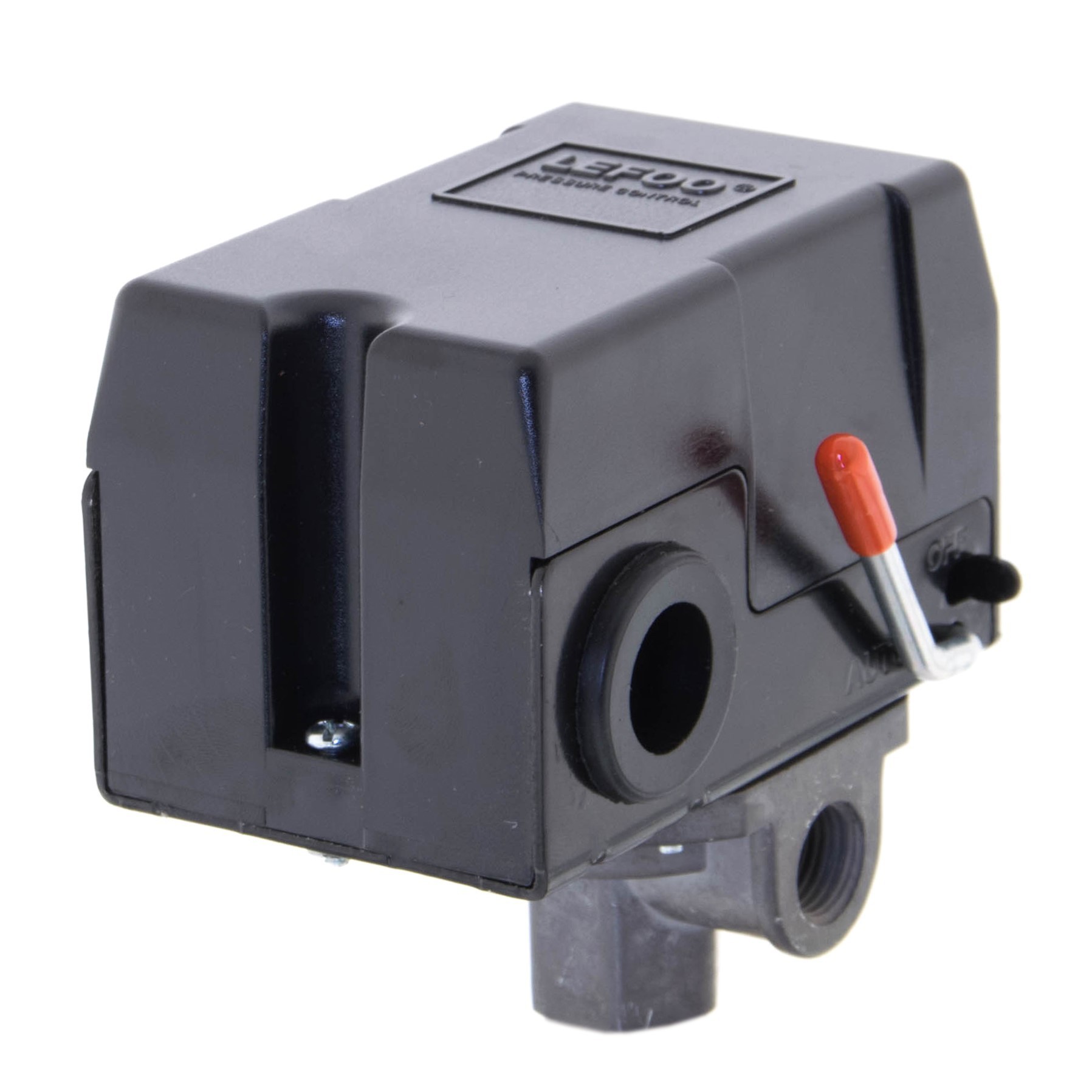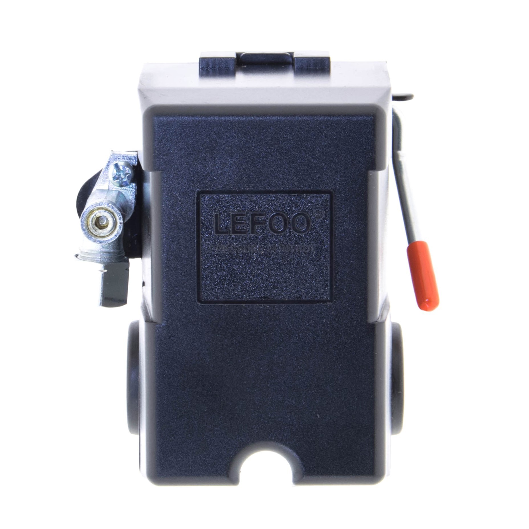 Przełącznik ciśnieniowy marki LEFOO, używany do utrzymywania ciśnienia w zbiorniku kompresora pomiędzy zadaną górną i dolną wartością ciśnienia. Sterownik przeznaczony do silników jednofazowych.