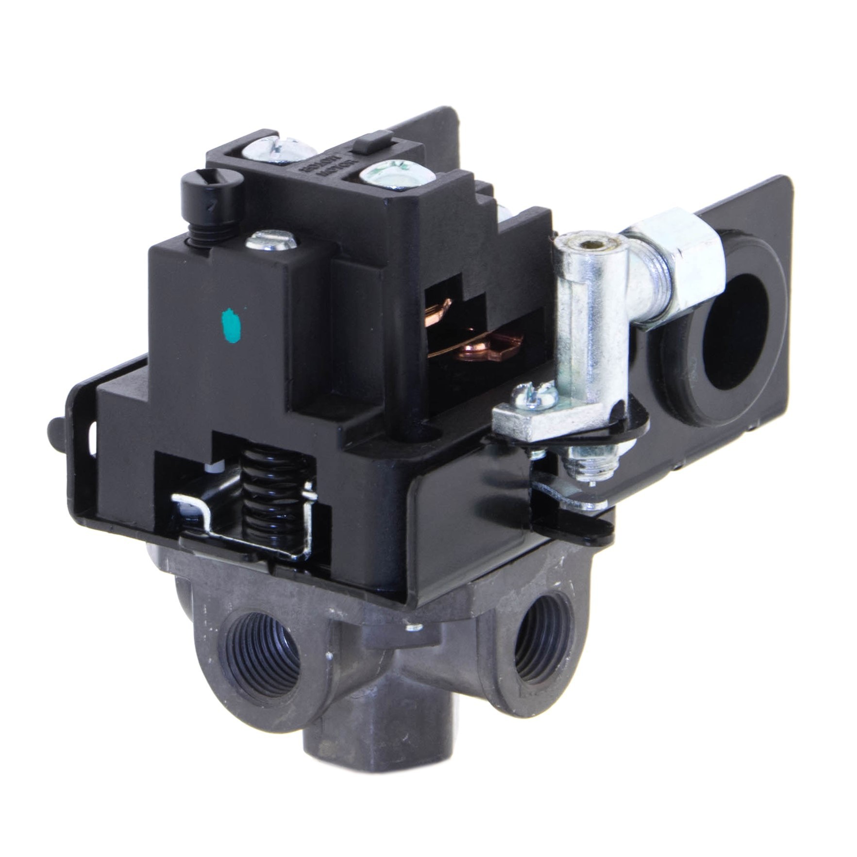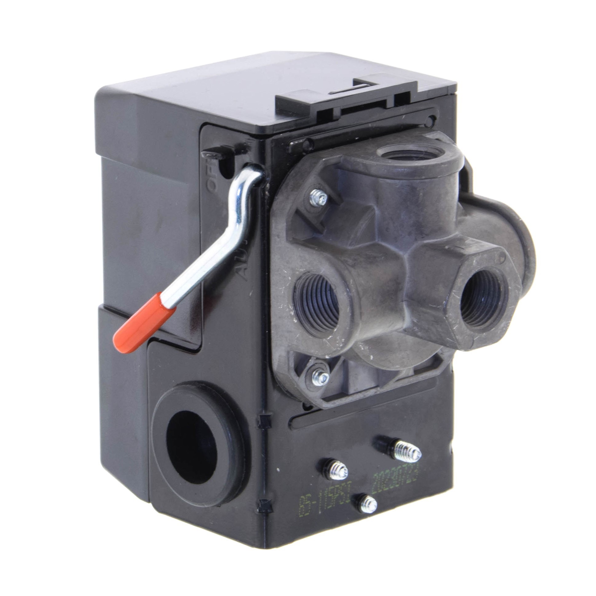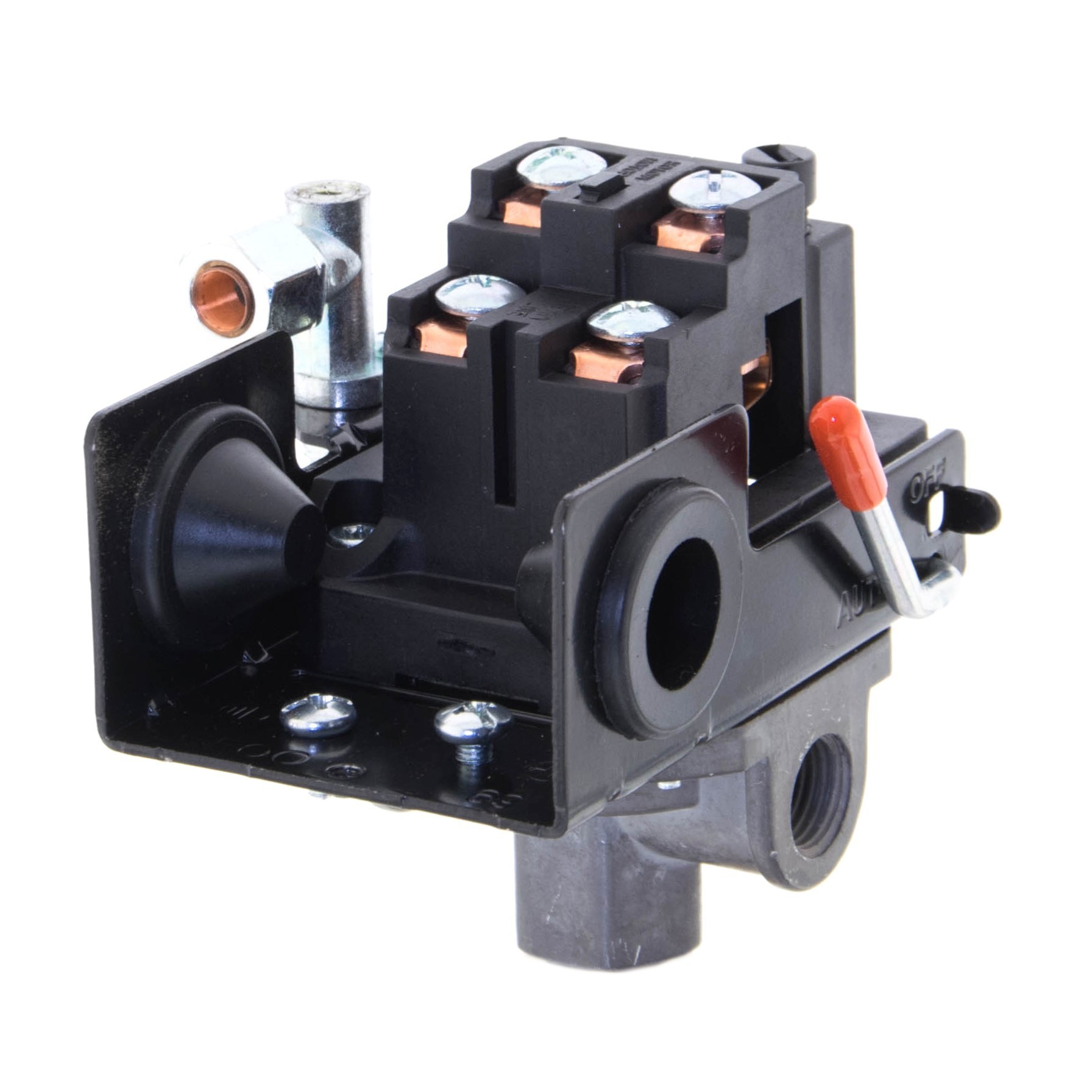 Presostat posiada cztery przyłącza wewnętrzne. Dolny gwint do zamocowania na zbiorniku kompresora i boczne gwinty do których można zamocować dodatkowe elementy według własnego zapotrzebowania - np. manometr, szybkozłącza, reduktor, zawór bezpieczeństwa.