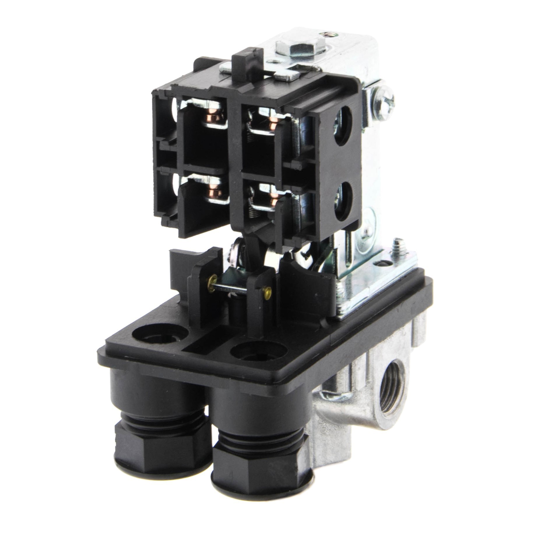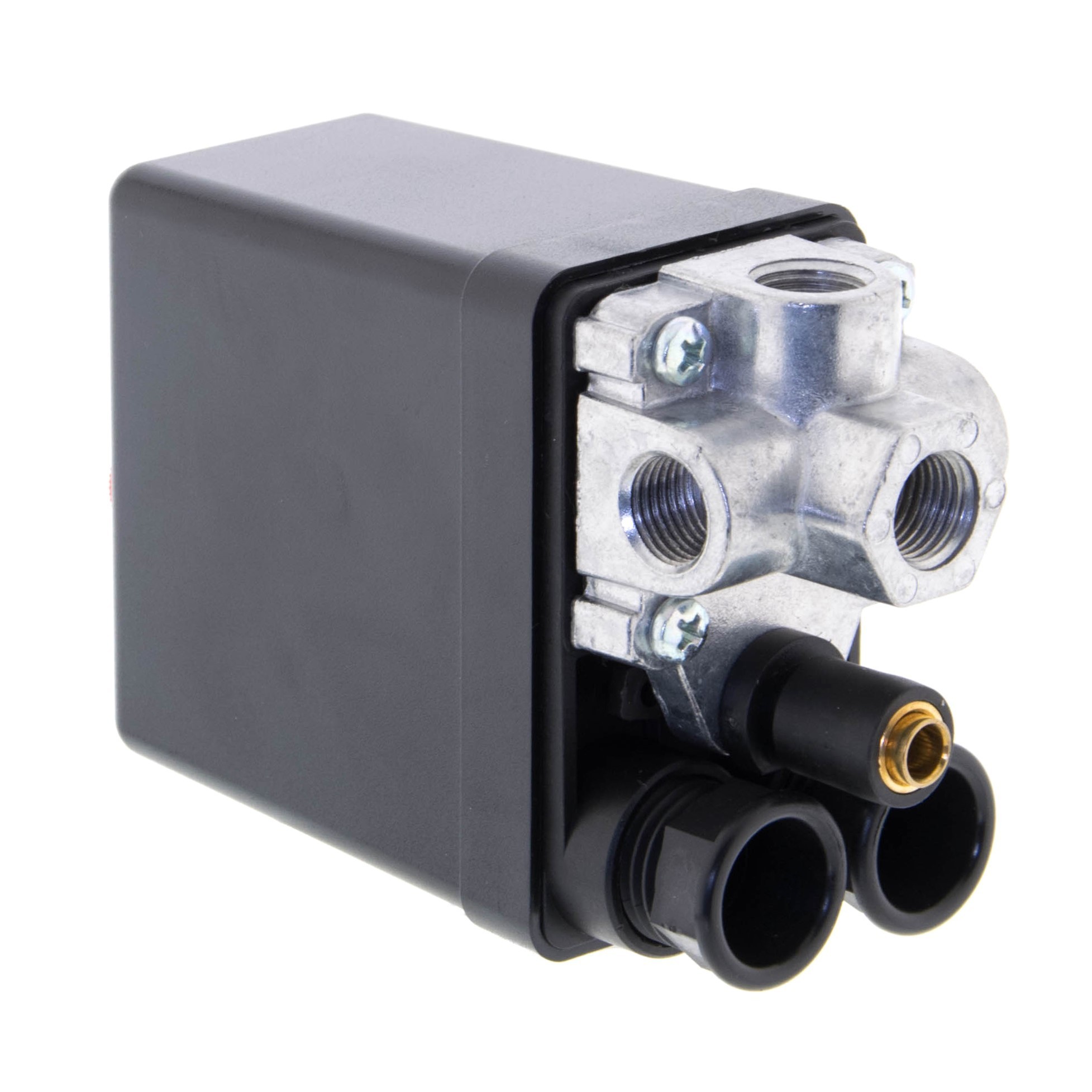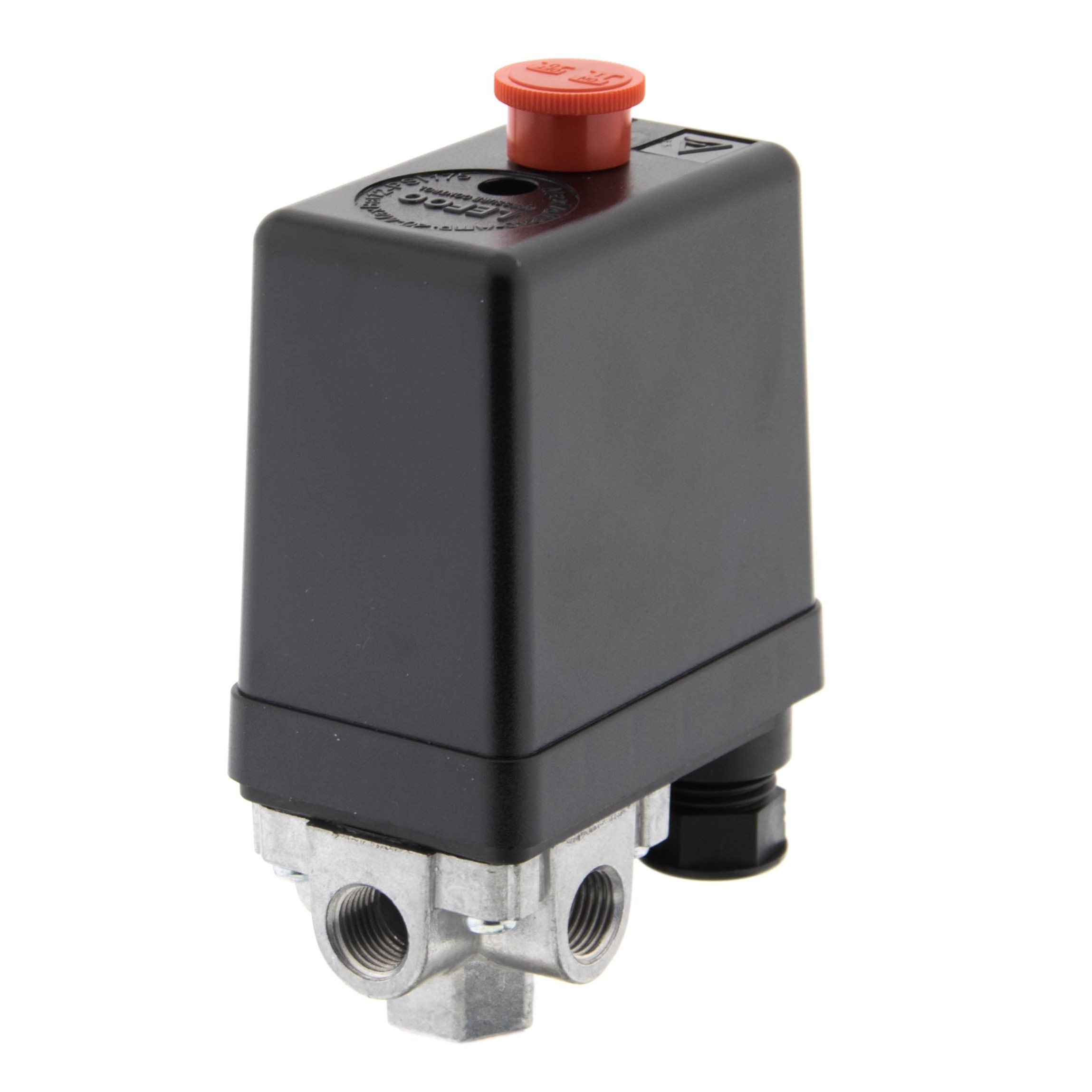 Presostat posiada cztery przyłącza wewnętrzne. Dolny gwint do zamocowania na zbiorniku kompresora i boczne gwinty do których można zamocować dodatkowe elementy według własnego zapotrzebowania - np. manometr, szybkozłącza, reduktor, zawór bezpieczeństwa.
