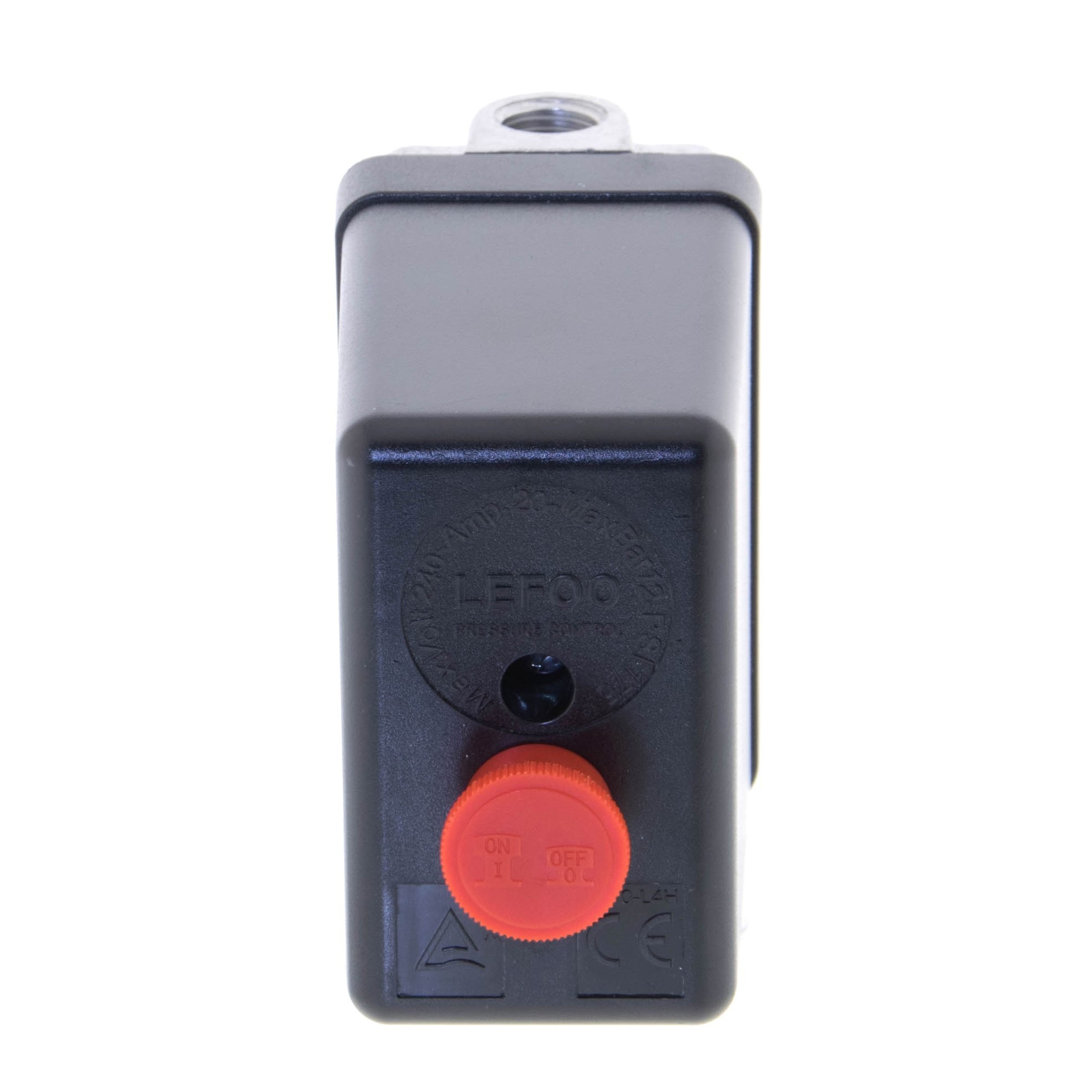 Przełącznik ciśnieniowy marki LEFOO, używany do utrzymywania ciśnienia w zbiorniku kompresora pomiędzy zadaną górną i dolną wartością ciśnienia. Sterownik przeznaczony do silników jednofazowych.