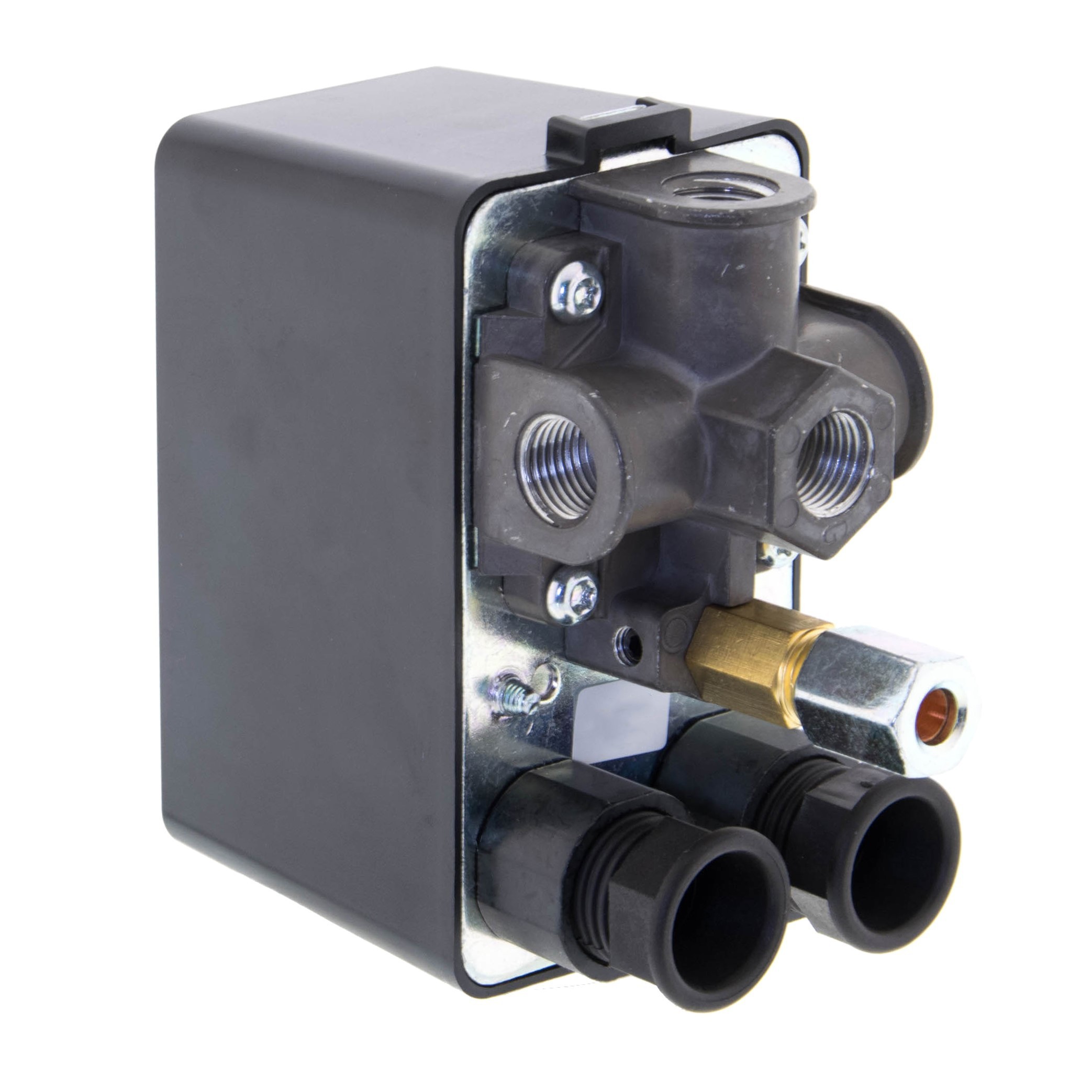 Presostat posiada cztery przyłącza wewnętrzne. Dolny gwint do zamocowania na zbiorniku kompresora i boczne gwinty do których można zamocować dodatkowe elementy według własnego zapotrzebowania - np. manometr, szybkozłącza, reduktor, zawór bezpieczeństwa.