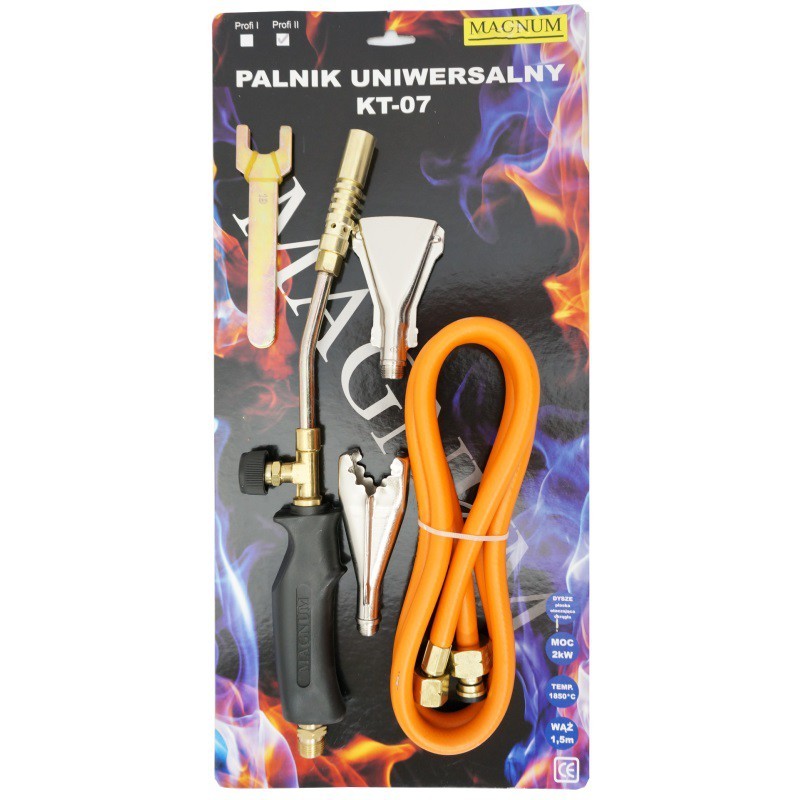 Łatwy w obsłudze uniwersalny palnik propanowo-powietrzny KT-07 marki MAGNUM zasilany gazem propan-butan z systemem mieszania inżektorowym (smoczkowym). Palnik przeznaczony jest do lutowania drobnych elementów ze stali oraz metali kolorowych, oraz przy podobnych pracach w których potrzebne jest zastosowanie płomienia o dużej energii np: