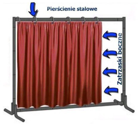 odgradzania stanowisk spawalniczych. Zapewnia ochronę osobom znajdującym się w pobliżu prac związanych ze spawaniem, cięciem i szlifowaniem. Chroni od promieniowania UV, iskier oraz odprysków spawalniczych o wysokiej intensywności. Zasłony spawalnicze nie są odpowiednikiem filtrów spawalniczych i chronią przed szkodliwością spawania z odległości powyżej 2 metrów. Zasłony posiadają zamontowane zaczepy pozwalające na łączenie zasłon w nieprzerwane pasy. Górna część kurtyny posiada szereg otworów
