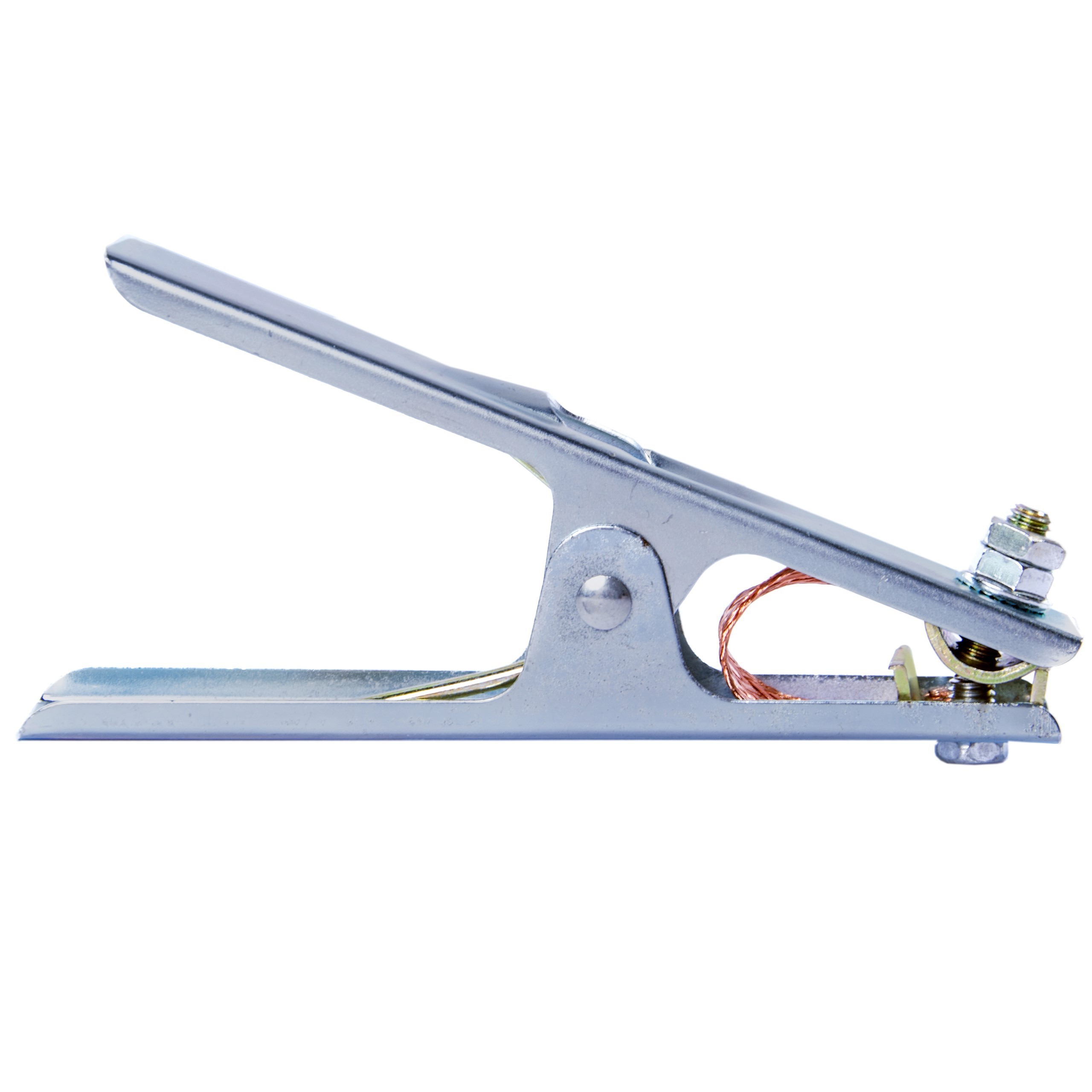 Zacisk kleszczowy, biegunowy MAGNUM o maksymalnej obciążalności prądowej do 250A, stosowany w spawalniczych przewodach masowych. Zacisk posiada solidną sprężynę oraz miedzianą taśmę łącząca elementy stykowe.