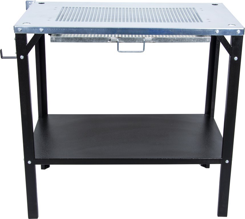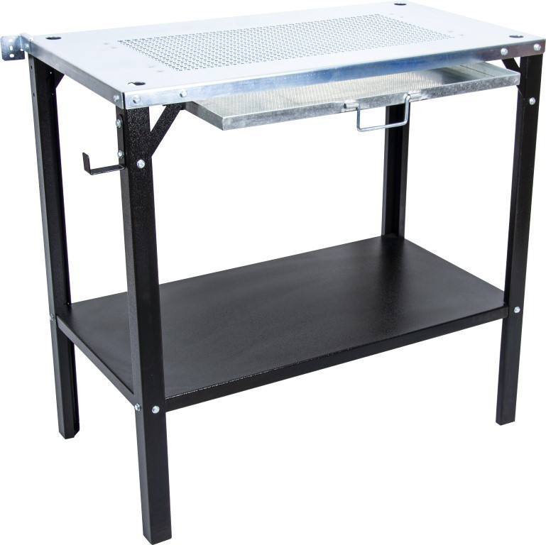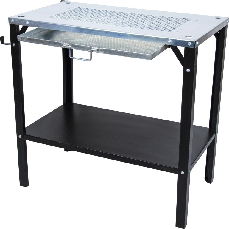 Stół spawalniczo-montażowy MAGNUM ze specjalnie wykonanym perforowanym blatem, półką oraz z szufladą na opiłki, odpryski metalu. Stół znajdzie zastosowanie w zakładach i warsztatach zajmującymi się obróbką metali. Na boku stołu zamontowano haczyk np. na uchwyt spawalniczy.