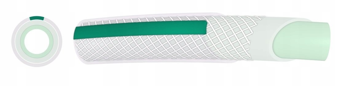 Wąż techniczny 4-warstwowy o zwiększonej szczelności i odporności na rozwarstwianie. Przewód wykonany jest z elastycznego PCV na bazie suspensyjnego polichlorku winylu, tereftalanu oraz innych komponentów, dodatkowo wzmocniony oplotem tekstylnym. Przeznaczony do transportu sprężonego powietrza, odporny na mgiełkę olejową oraz skręcanie.