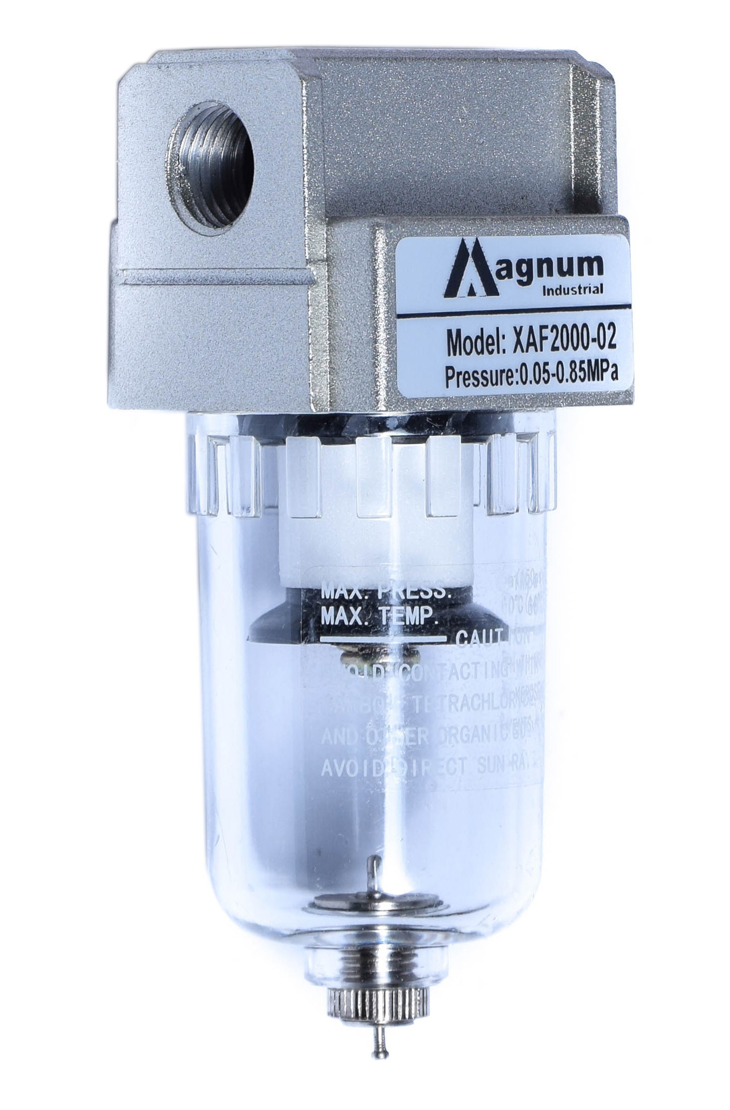 Filtr powietrza marki MAGNUM służy do oczyszczenia sprężonego powietrza. Wkładka cyklonowa powoduje osadzanie się kondensatu w zbiorniku, a wkład filtracyjny zabezpiecza układ przed przedostaniem się zanieczyszczeń stałych i płynnych o wielkości przekraczającej jego gradację.