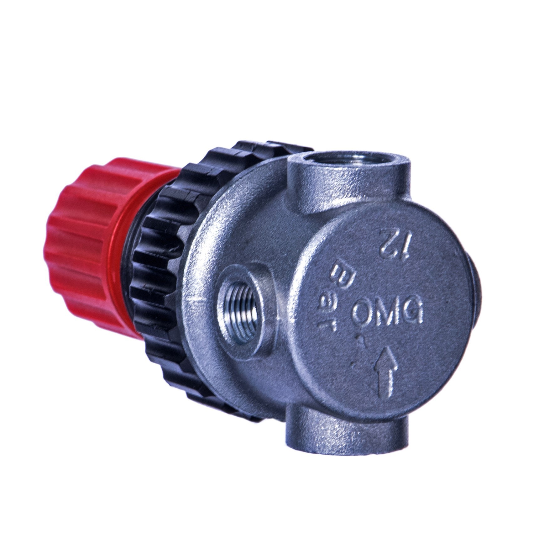 Profesjonalny reduktor ciśnienia powietrza Włoskiej marki OMG. Reduktor membranowy pozwala na ustalenie stałej wartości ciśnienia wyjściowego niezależnie od wahań ciśnienia wejściowego przekraczającego ciśnienie wyjściowe. Reduktor posiada cztery przyłącza gwintowane do których można zamocować złącza według swoich potrzeb.