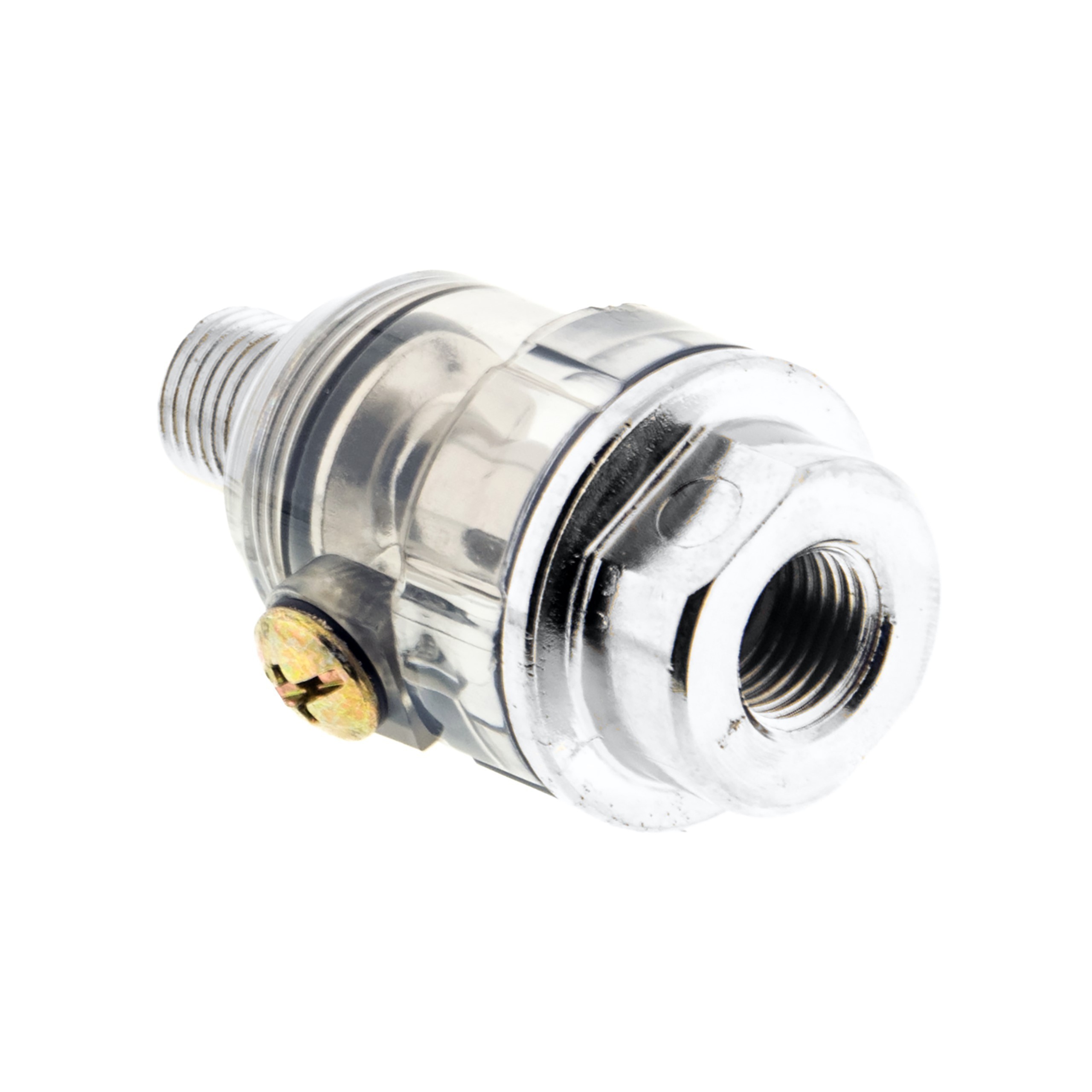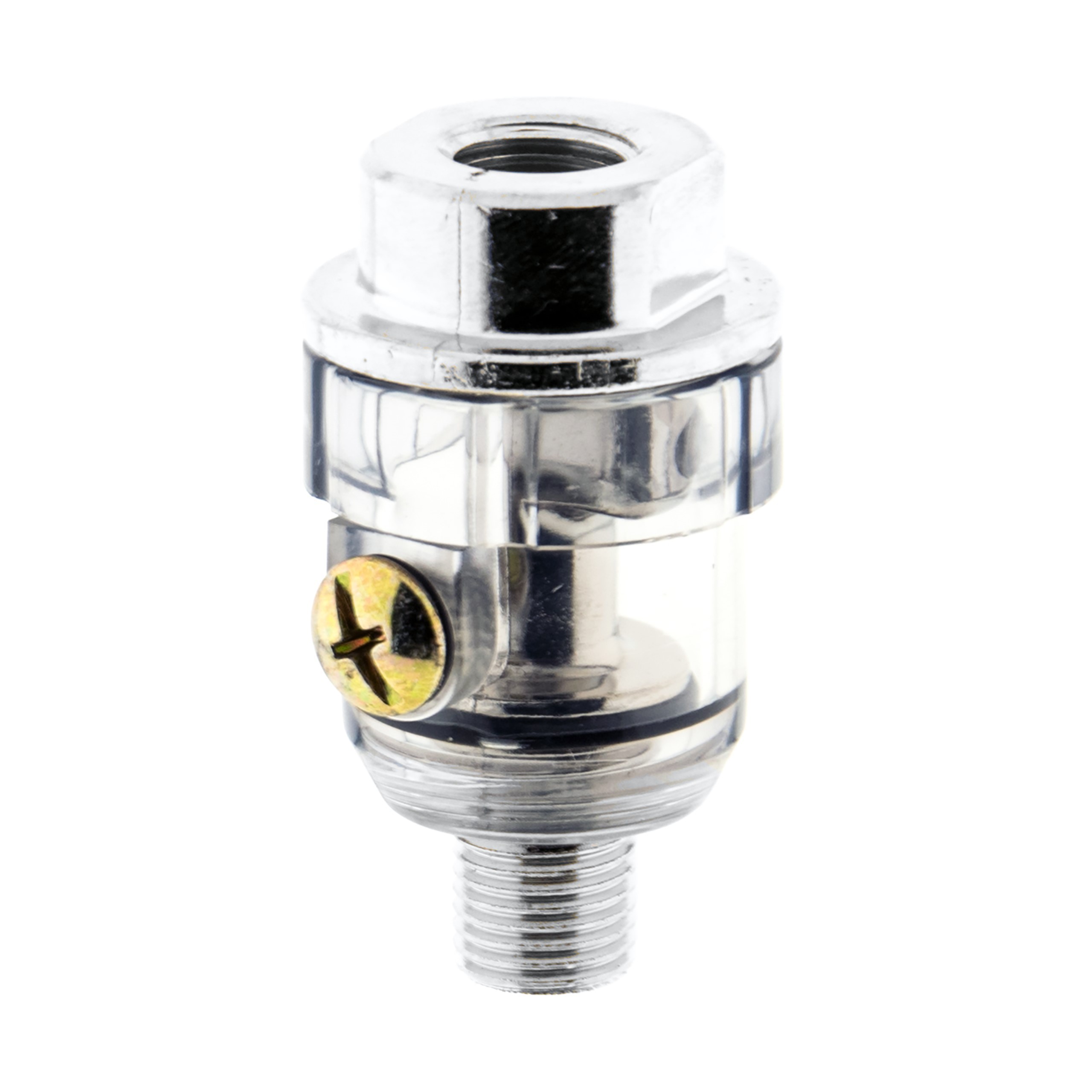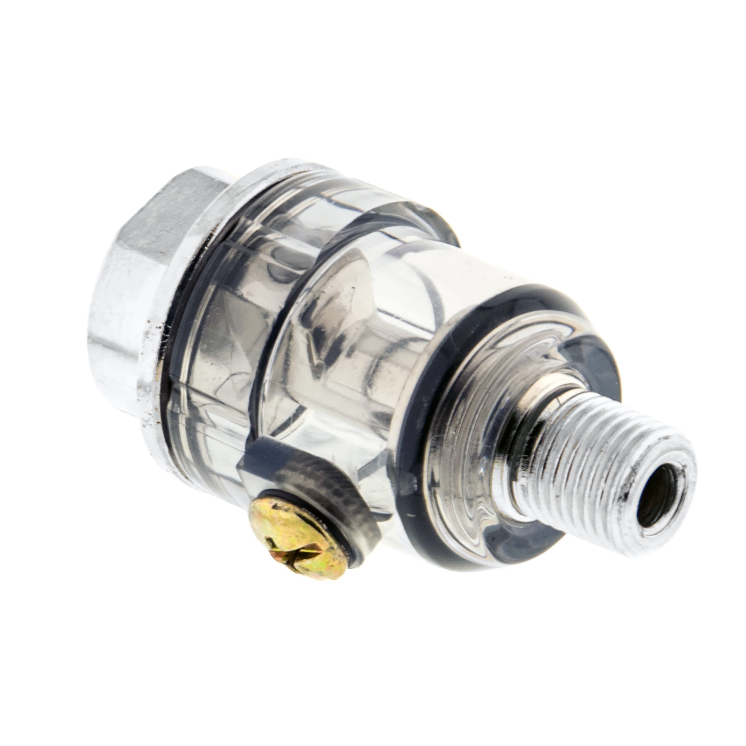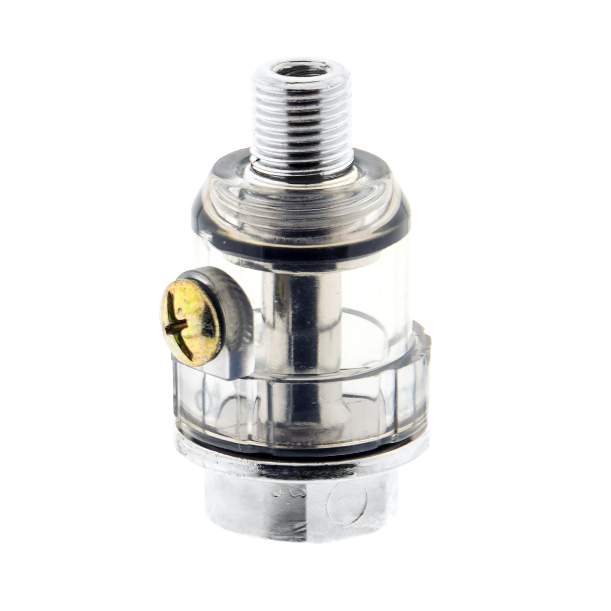Mała smarownica do narzędzi pneumatycznych. Mocowana bezpośrednio pod narzędziem, gwarantuje lepsze smarowanie niż smarownice naścienne. Możliwość montażu w dowolnym kierunku przepływu.