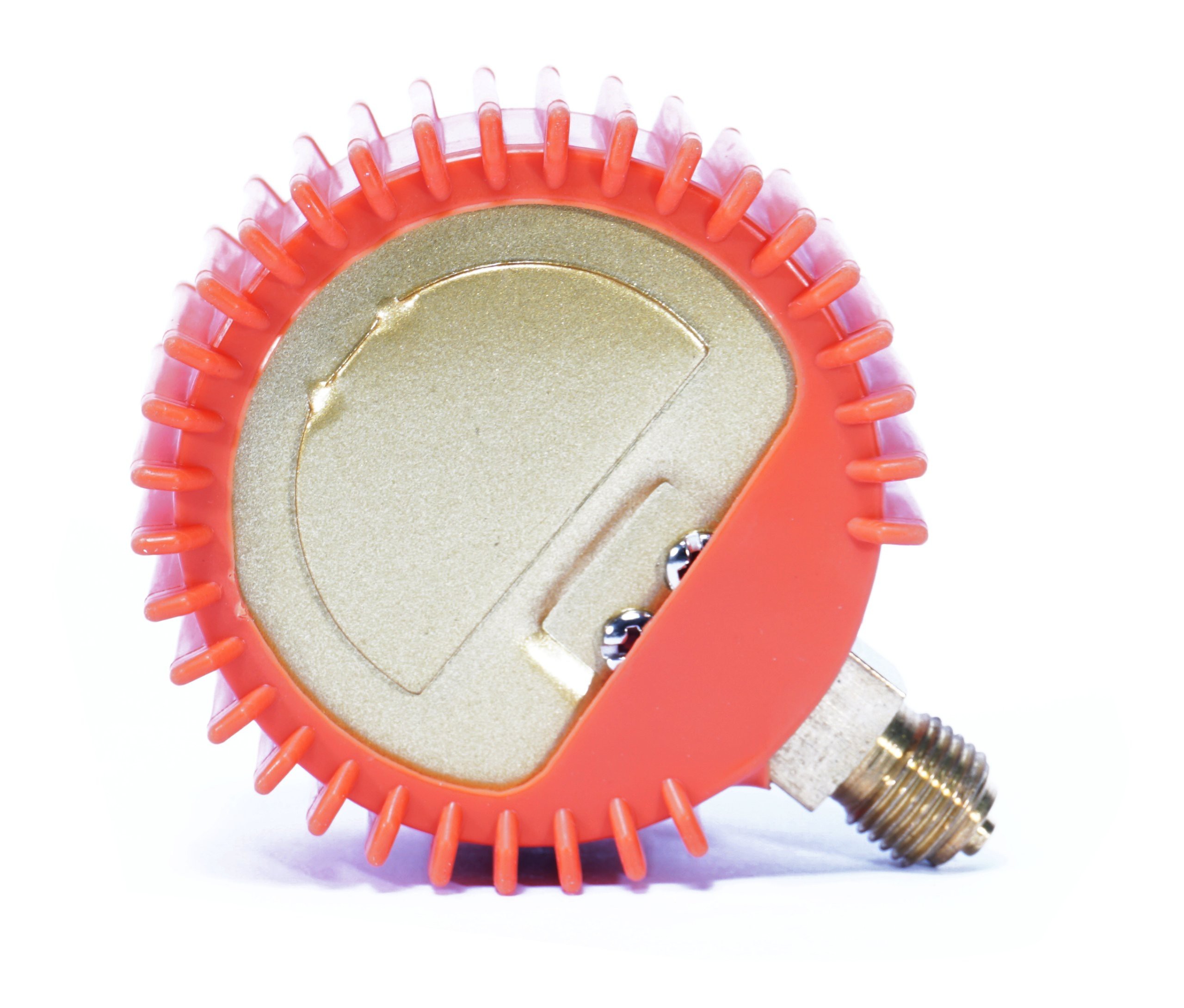 Manometr zegarowy do reduktorów butlowych spawalniczych z osłoną gumową. Manometr działa na zasadzie sprężystego odkształcenia sprężyny rurkowej Bourdona pod wpływem zmiany zadanego ciśnienia.